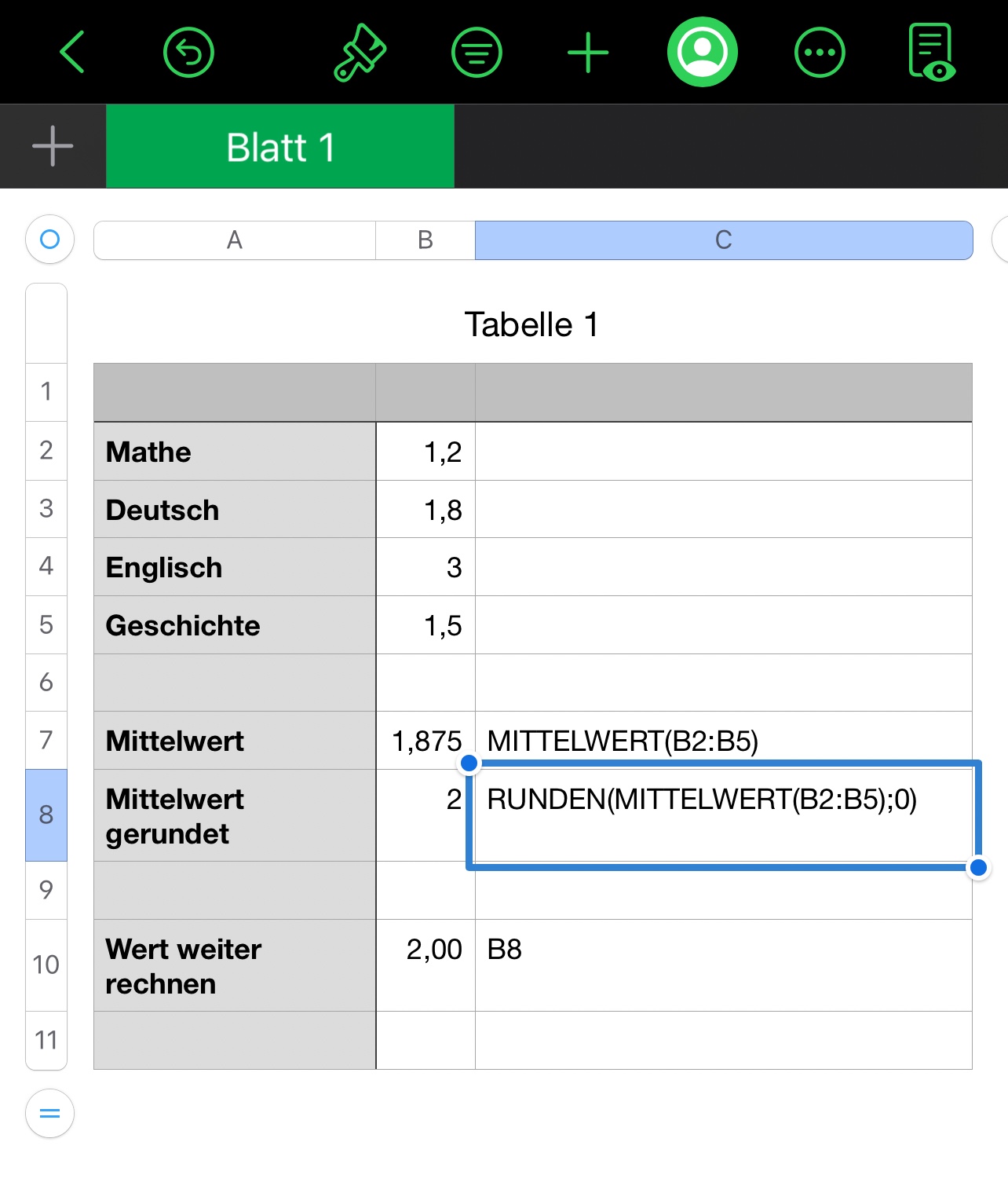 Mein Problem ist nun, dass ich es nicht schaffe, dass aus dem gerundeten TÜ-Mittelwert (Teil-Mittelwert) ein ganzzahliger Wert entsteht, mit dem der Gesamt-Mittelwert berechnet werden kann. Ich kann zwar einen gerundeten Wert anzeigen lassen, aber bei der Berechnung des Gesamt-Mittelwertes rechnet er mit dem Teil-Mittelwert. Dadurch wird die Gesamt-Note verfälscht.