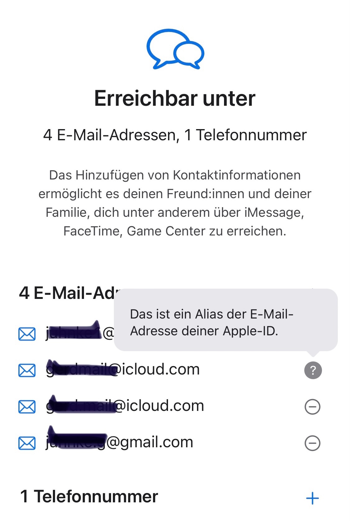 Ich habe eine alias Adresse erstellt und möchte diese als Apple ID verwenden, bekomme aber die Fehlermeldung "Du kannst nur die @iCloud.com Adresse hinzufügen, die bereits in deinem Account hinterlegt ist"