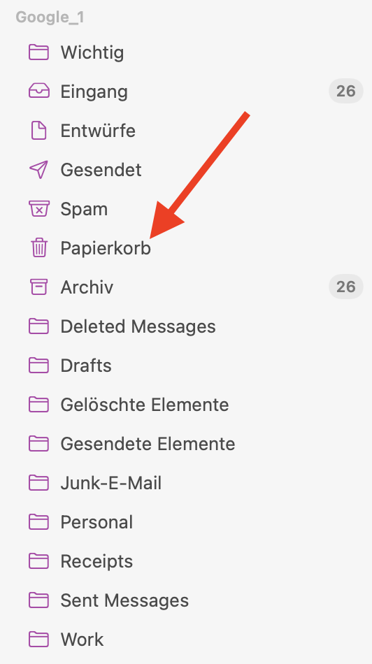 Ich meinte auch den eigenen Papierkorb von Mail in der Seitenleiste.