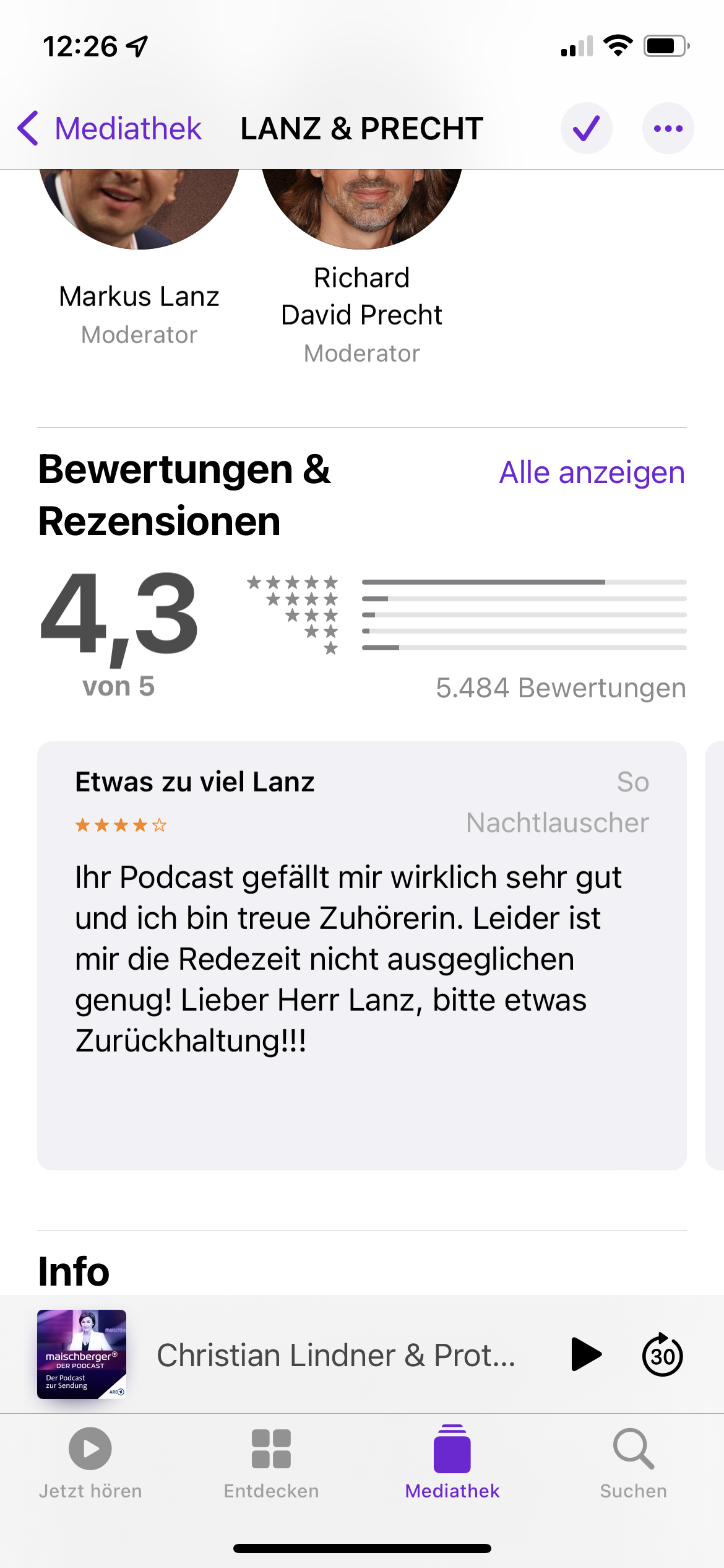 Hallo, danke für die schnelle Antwort. Nur bei meinem iPhone, nicht aber bei meinem iPad, sind die Sterne für die Bewertung eines Podcasts verschwunden. Das betrifft alle abonnierten Podcasts, nicht nur ausgewählte.