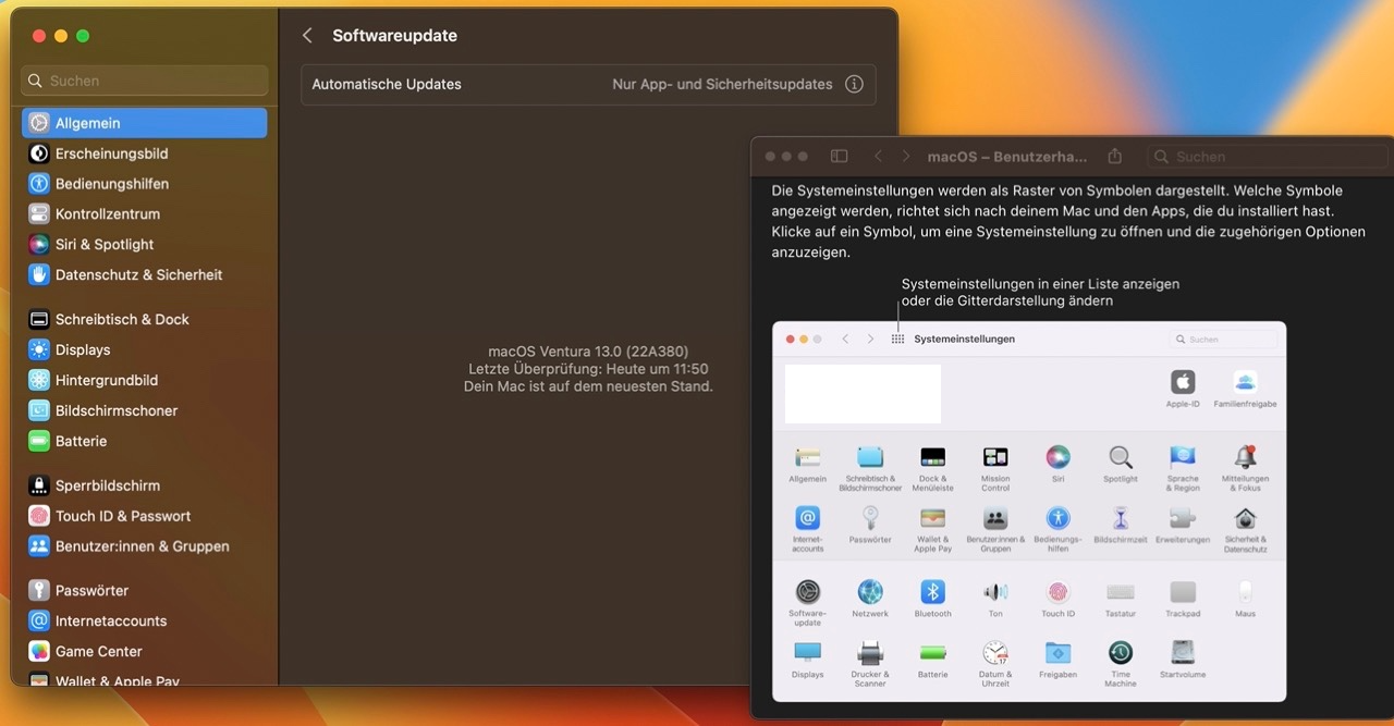 Das digitale macOS-Benutzerhandbuch - aufgerufen zum Beispiel im Finder über Hilfe > macOS-Hilfe oder in den Systemeinstellungen über Hilfe > Systemeinstellungen-Hilfe - zeigt auf meinem MacBook Pro nach dem Update auf macOS 13 Ventura nicht etwa Hilfeseiten zum installierten macOS Ventura, sondern nach wie vor Hilfeseiten zum vorherigen macOS 12 Monterey!