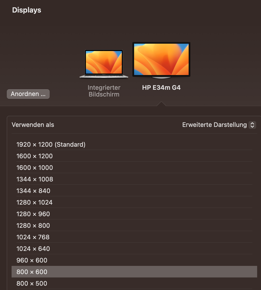 Bei meinem MacBook Air 2020 lässt sich keine vernünftige Bildschirmauflösung für den externen Monitor einstellen. Der HP E34m G4 Monitor hat eine Auflösung von 3440 zu 1440.