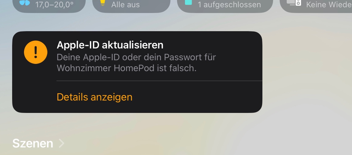 Seit einiger Zeit kriege ich in HomeKit immer die Anzeige, dass ich für die HomePods meine Apple ID aktualisieren soll: