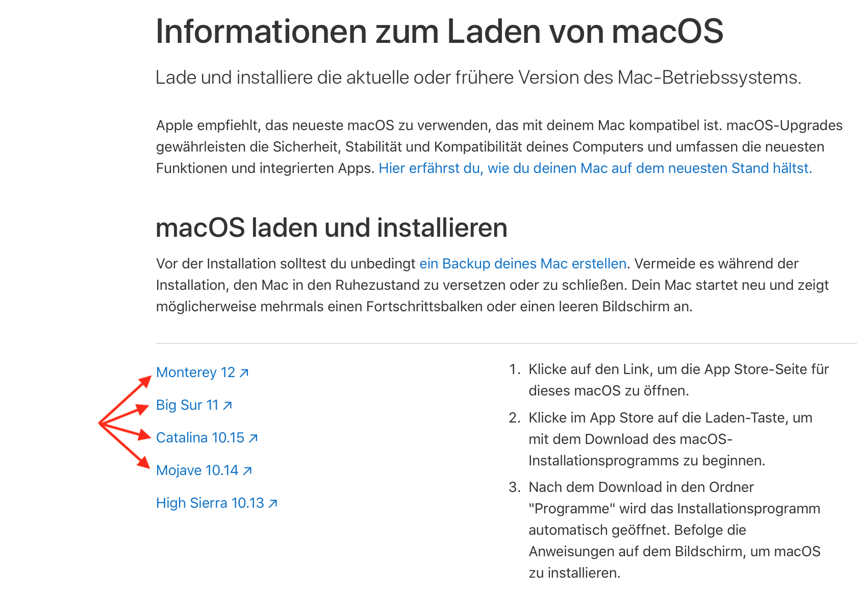 Wenn also ein mögliches Upgrade für dein MB Air aufgeführt ist, starte Safari ❗️und klicke einfach den mit rotem Pfeil markierten Link auf der nachfolgenden Seite des Apple Support an
