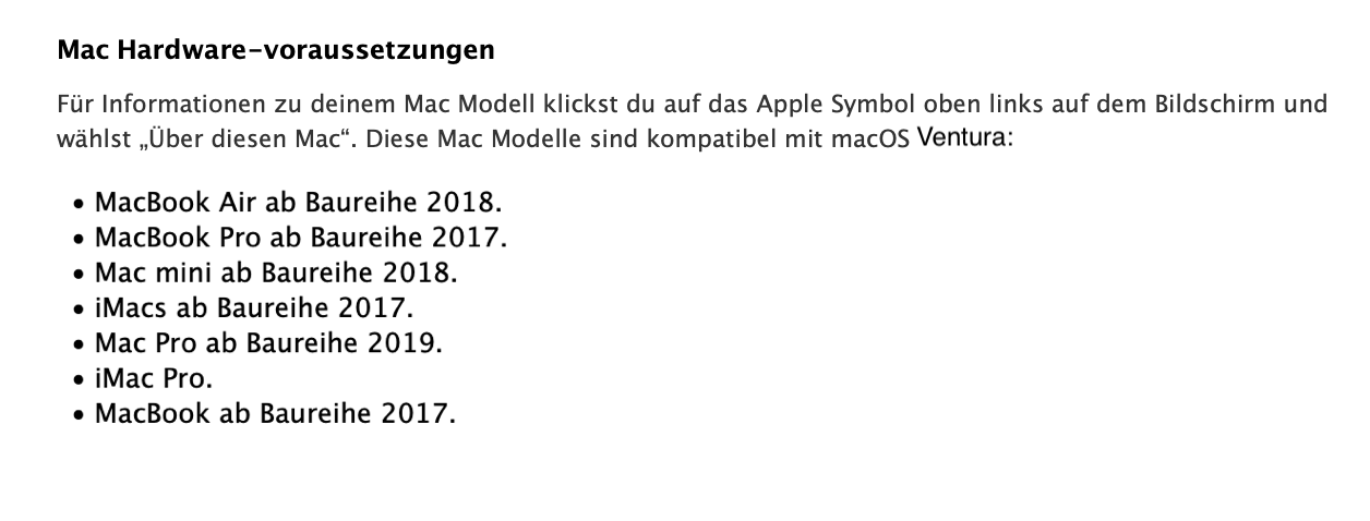 Ferner bestimmt das Modelljahr deines MB Air über mögliche Upgrades auf Mojave, Catalina, Big Sur, Monterey oder Ventura