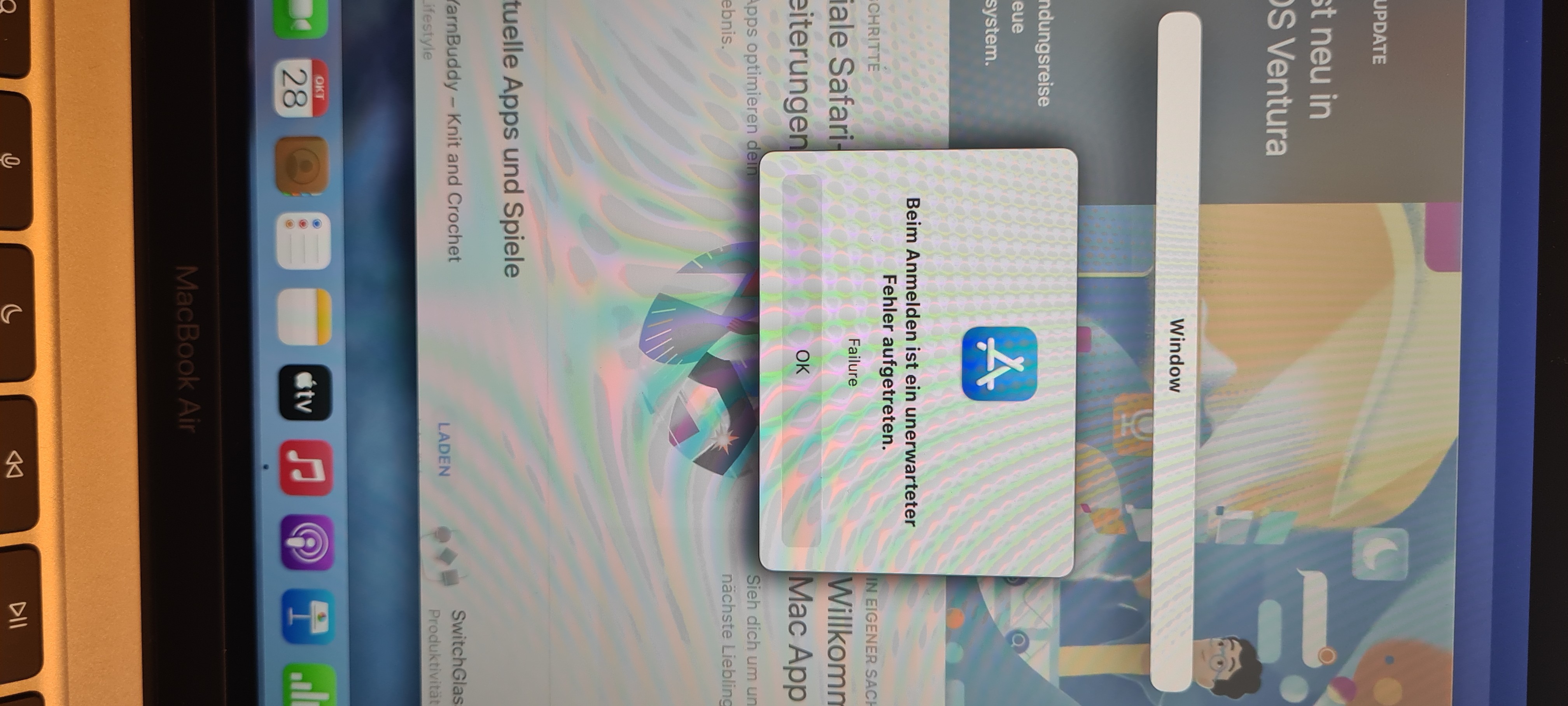 Ich habe mich gestern mit einer anderen Appel ID im App Store angemeldet. Später dann mit meiner eigentlichen, seit dem ist auf dem Bildschirm eine Fehlermeldung die ich nicht mehr zu bekomme. Ich kann das MacBook jedoch auch nicht einfach Neustarten weil das Fenster dies blokiert. Gibt es da einen Trick?