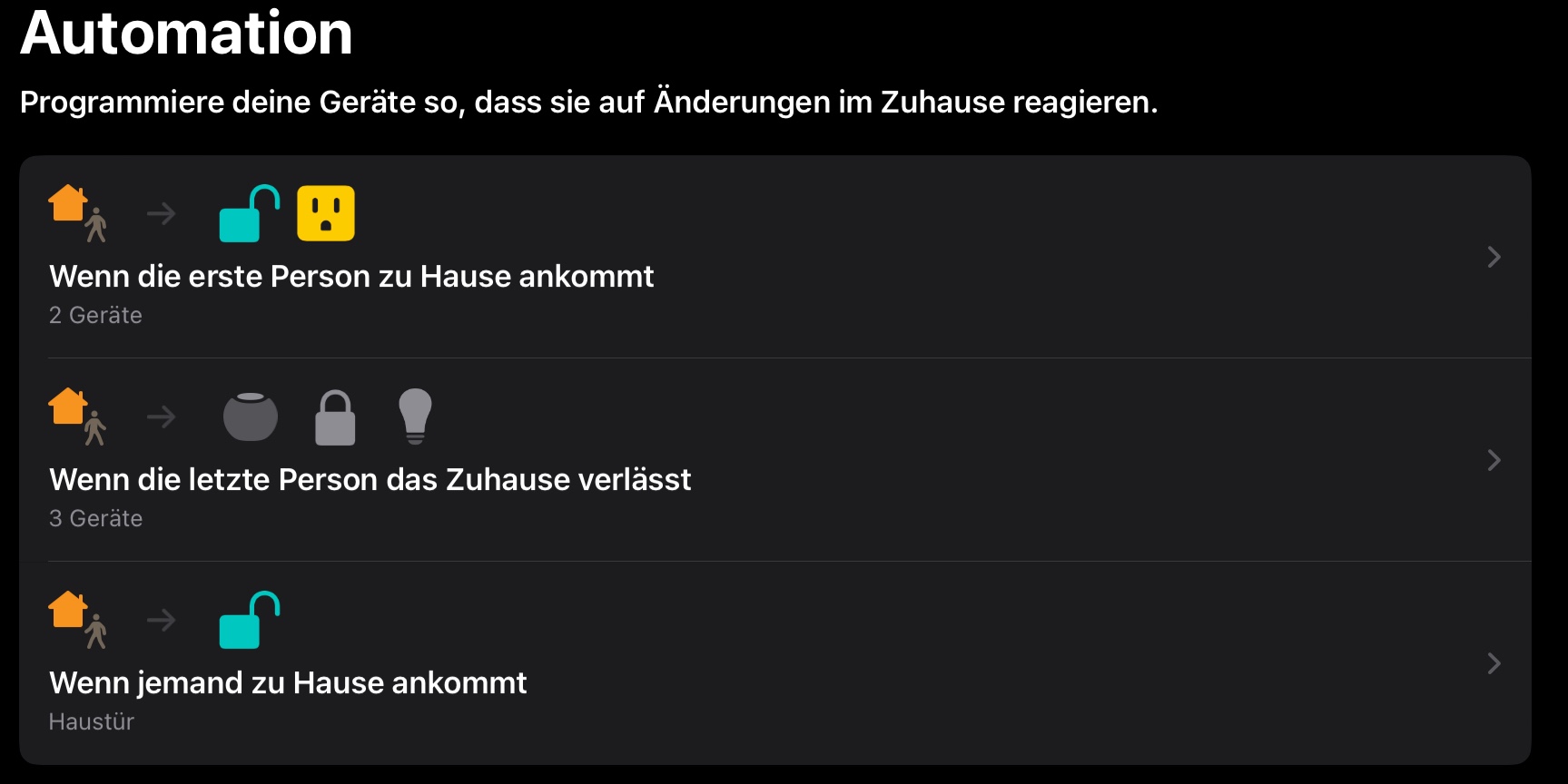 wir nutzen die HomeKit Automationen „wenn die erste Person…“ und „…jemand zu Hause ankommt“ um unsere Haustür mit dem Yale Linus Schloss zu öffnen und unsere Bosch Smarthome Alarmanlage zu deaktivieren. Oder, wenn jemand nach Hause kommt, nur die Tür zu öffnen.