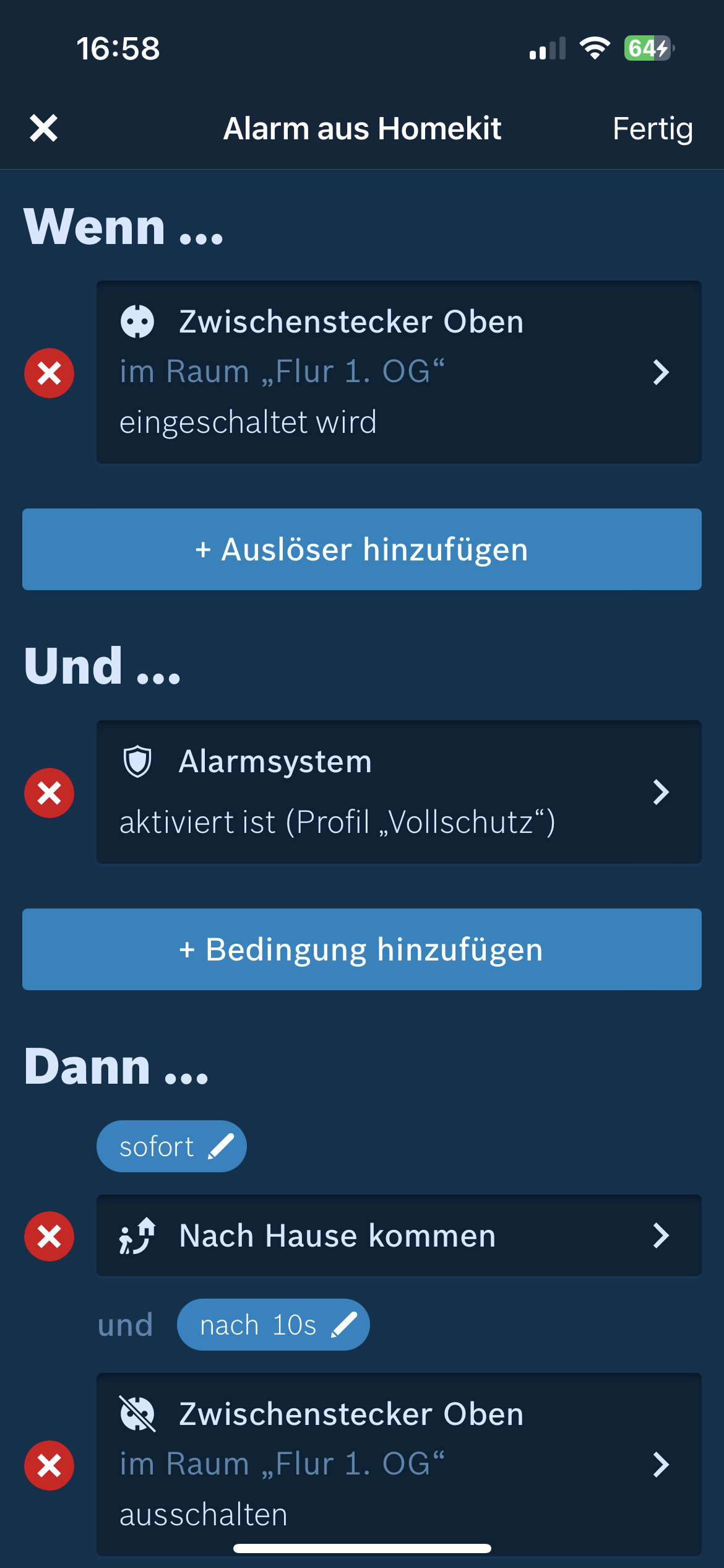 Wenn jetzt versehentlich „Wenn jemand zu Hause ankommt“ bestätigt wird, wird nach Betreten des Hauses der Alarm ausgelöst, weil das Alarmsystem nicht deaktiviert.