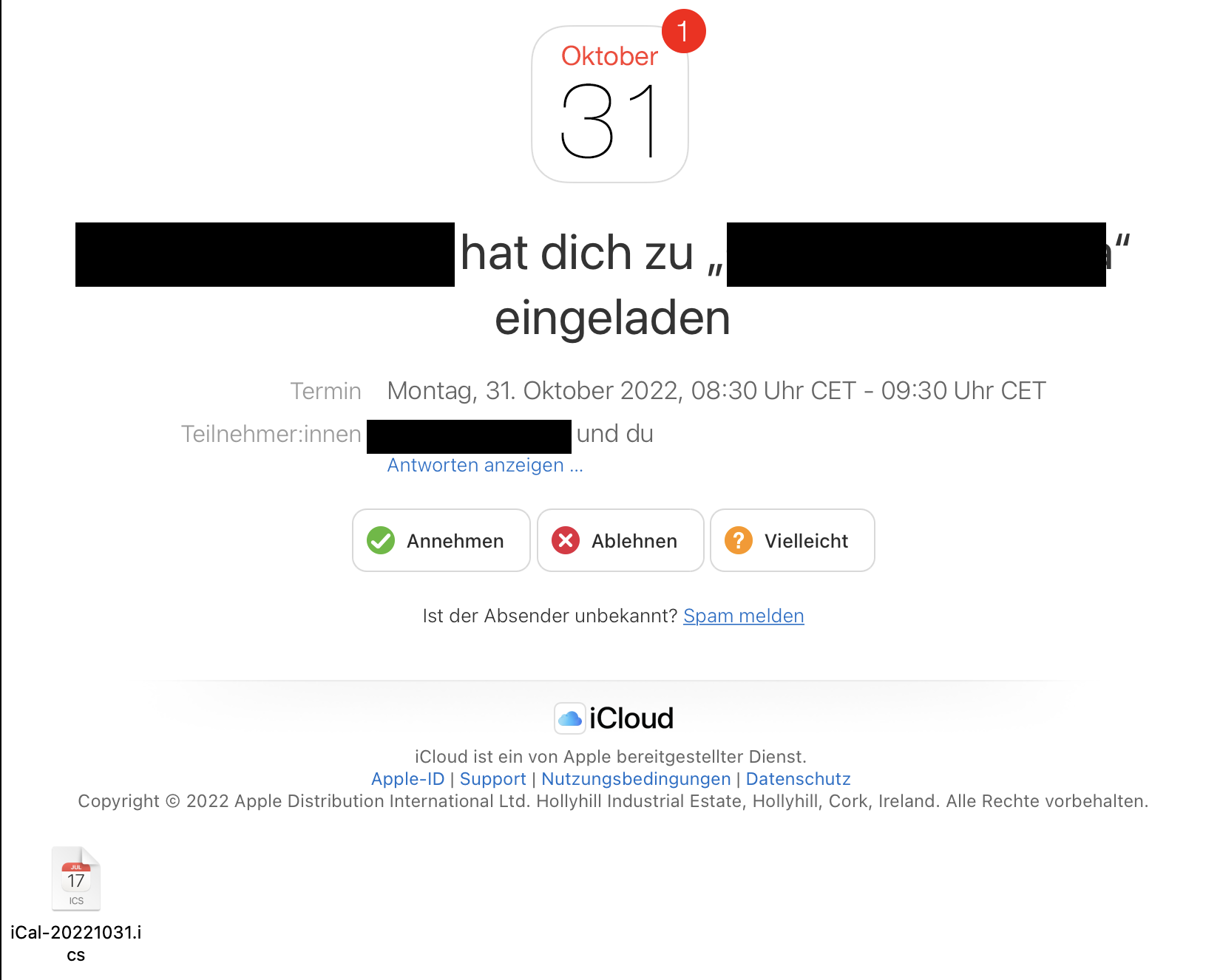 • Bei manchen Empfängern (z.B. web.de) kommt die Einladung so schön an, wie in einem Post vorher gezeigt mit Annahme/Ablehnung-Option.