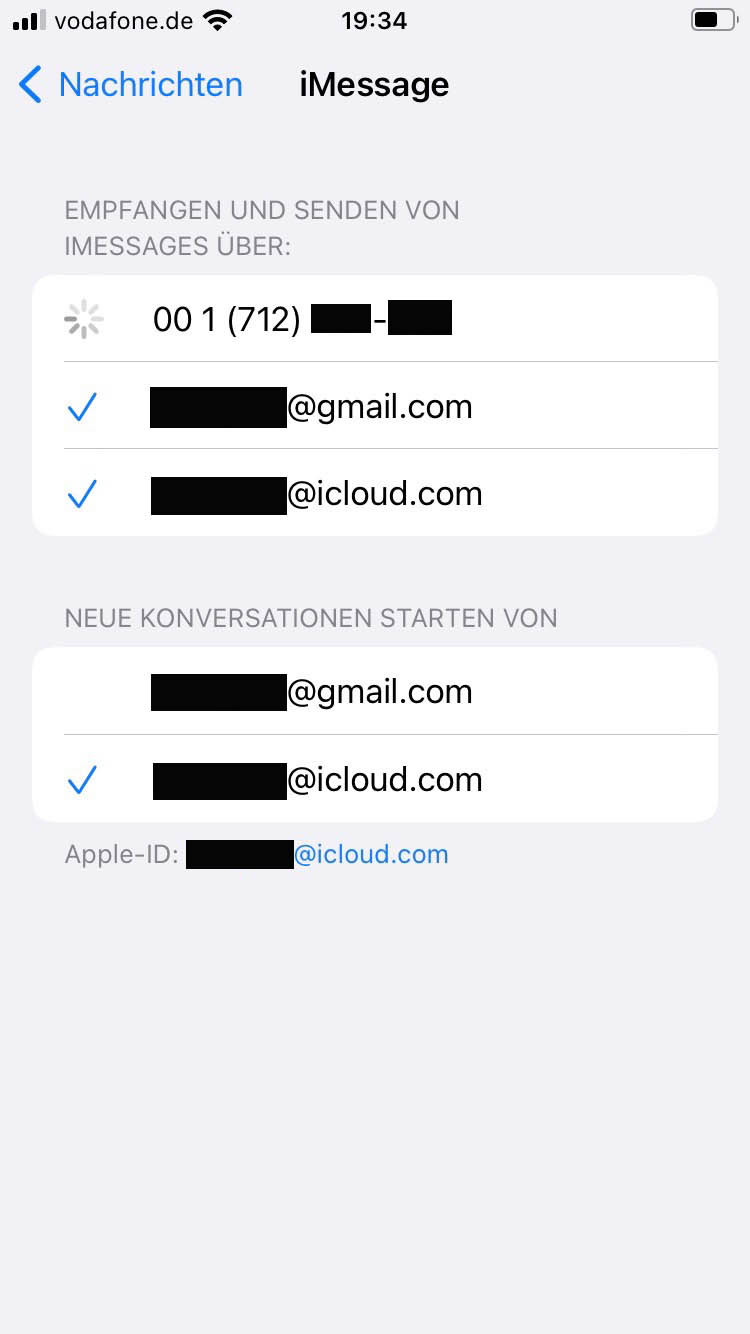 bei den Einstellungen von iMessage und FaceTime wird meine deutsche Nummer mit einer amerikanischen Vorwahl (001) angezeigt. Zum Senden und Empfangen kann ich die Nummer nicht anwählen, sondern nur meine iCloud Adresse. Abmelden und neu Anmelden sowie Änderung des Passwortes bringt keine Lösung. Ich bekomme ständig die falsche Nummer angezeigt obwohl bei der Apple-ID die Nummer mit der deutschen Vorwahlangezeigt wird.