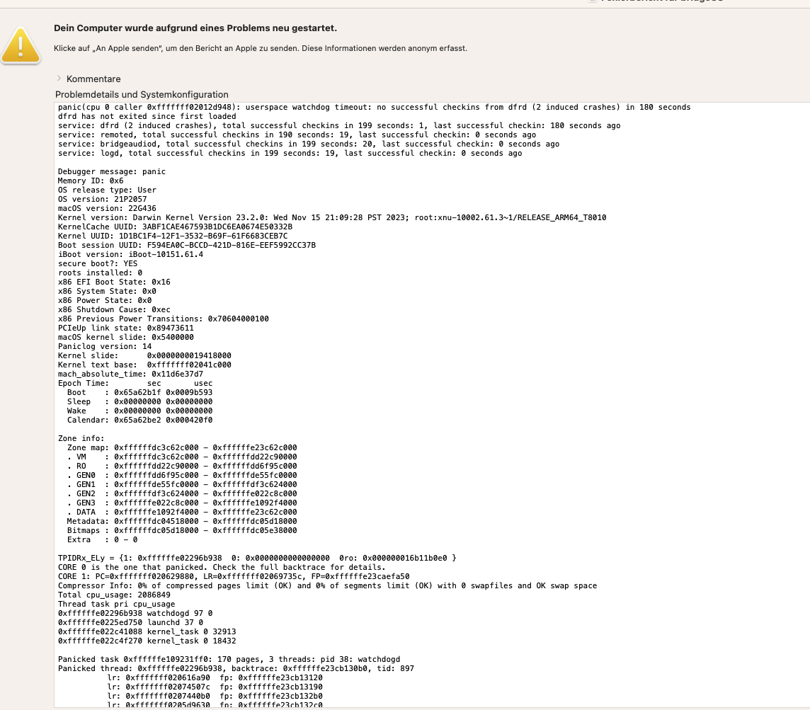 Seit ich Ventura auf meine MacBook Pro installiert habe, stürzt mein Laptop nach dem Ruhezustand oftmals ab, aber nur nach längerem Ruhezustand, also über Nacht. Nicht jeden Tag, aber fast täglich. Bekomme dann einen Absturzbericht. Mein PC Supporter konnte nicht herausfinden, woran es liegt. Hat jemand eine Idee?