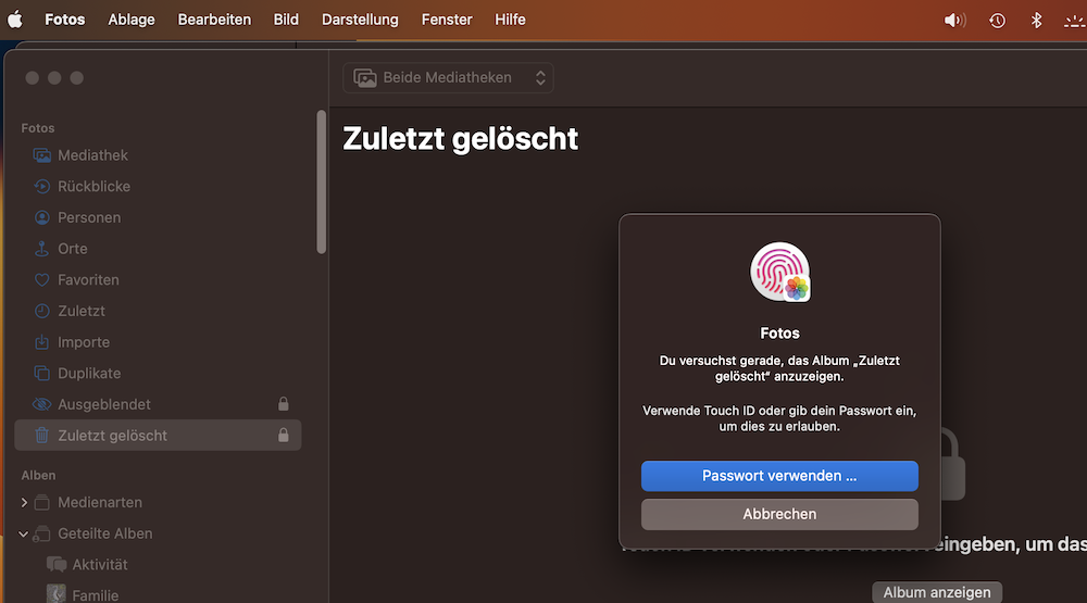Seit macOS Ventura ist in der Fotos-App "zuletzt gelöscht" Passwort geschützt