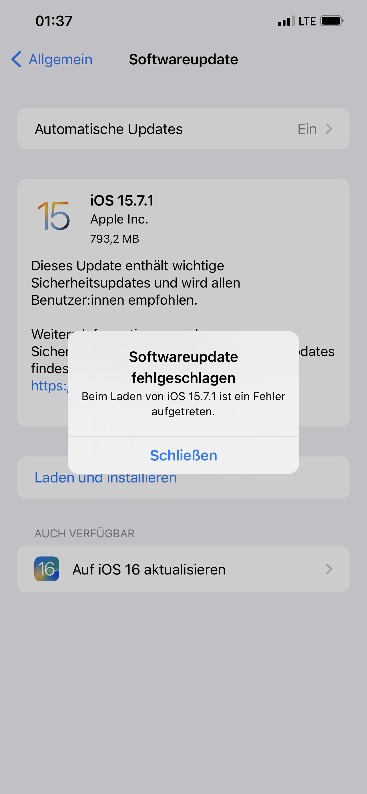 Für ein Update benötigst du 5G + oder WLAN, mit LTE funktioniert das nicht.
