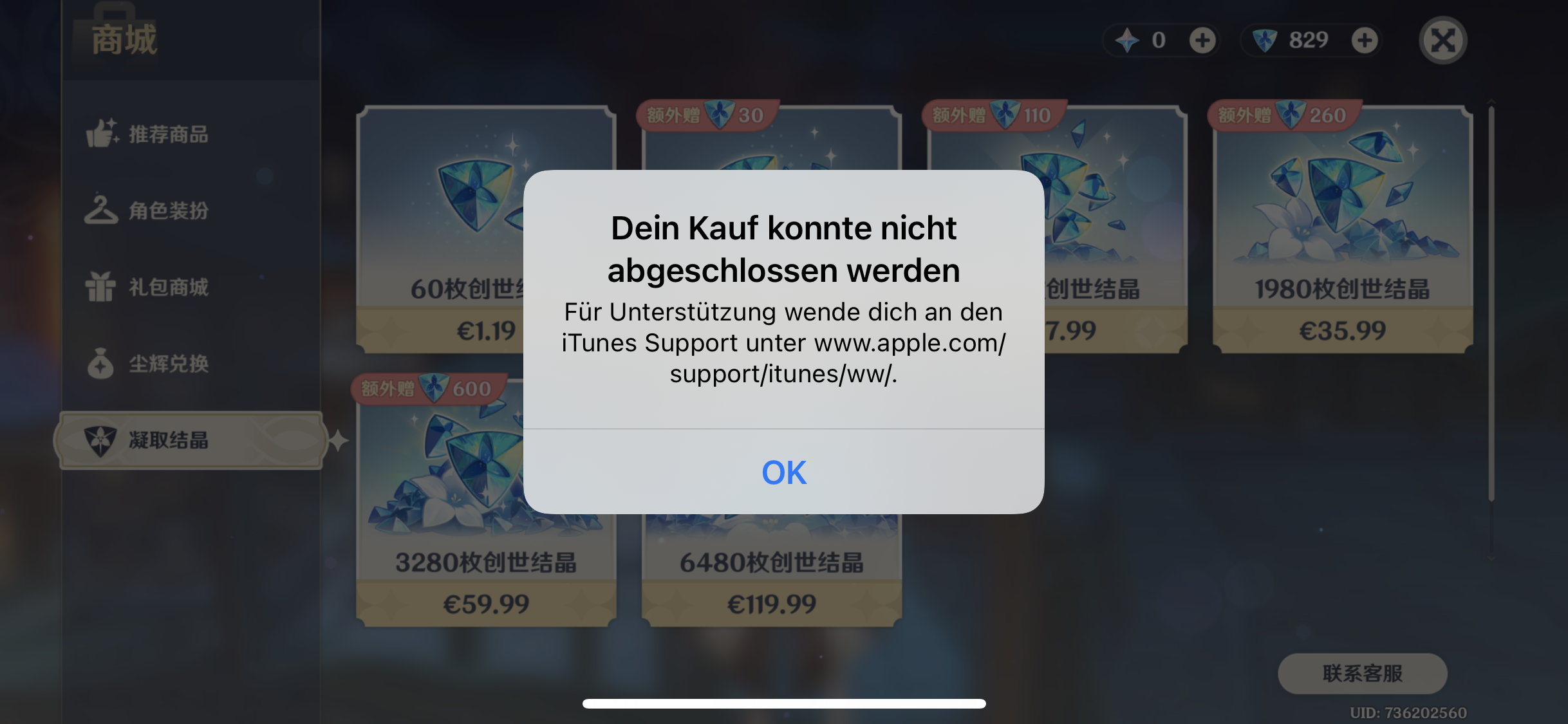 Obwohl ich ein Guthaben von 380 Euro habe, kann ich das Spiel Genshin Impact nicht aufladen.