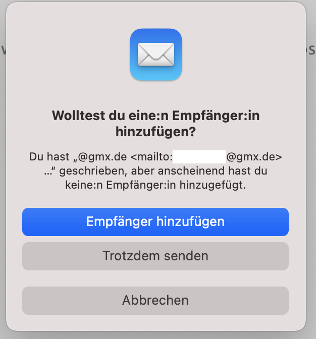 Abgesehen davon war die Meldung aber auch falsch, weil in allen Feldern (An:/Kopie:/Blindkopie:) entweder ein korrektes Format oder nichts stand. Vom Macbook war ein Versand ohne "Fehlermeldung" nicht möglich. Erst nach Abspeichern als Entwurf und anschließendem Versenden am iPhone hat alles geklappt. Egal, mir war der fehlende Gender-Button eine Freude...