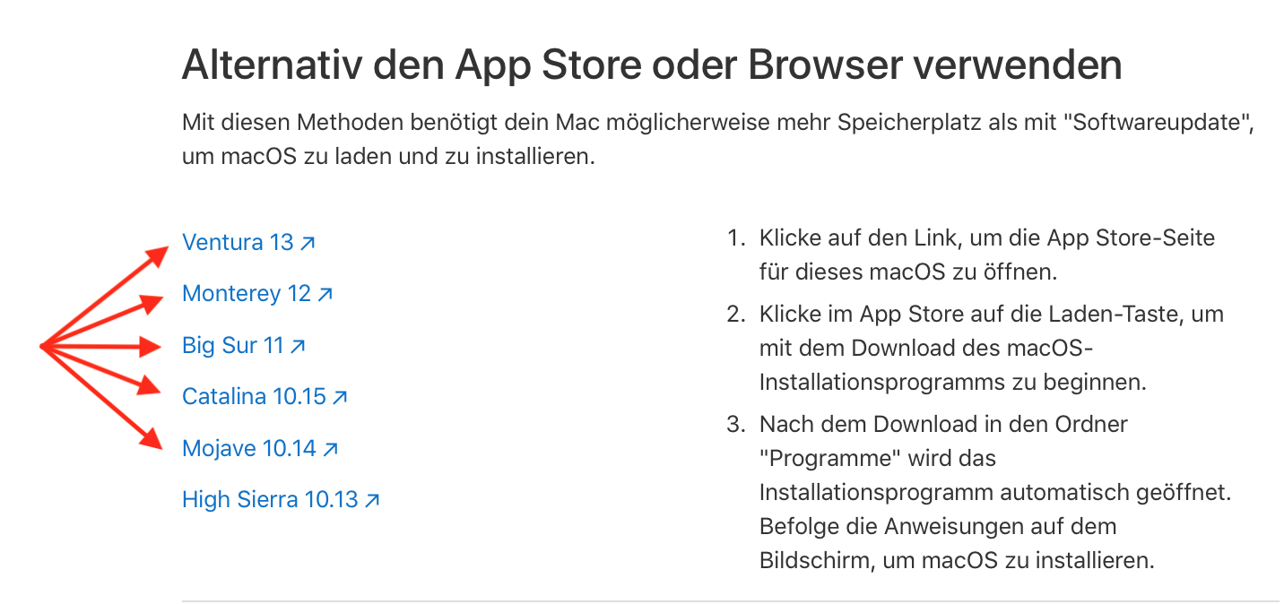 Ein Klick auf einen der markierten Links wird dich automatisch in den App Store portieren, aus dem du ein kompatibles MacOS laden und installieren kannst.