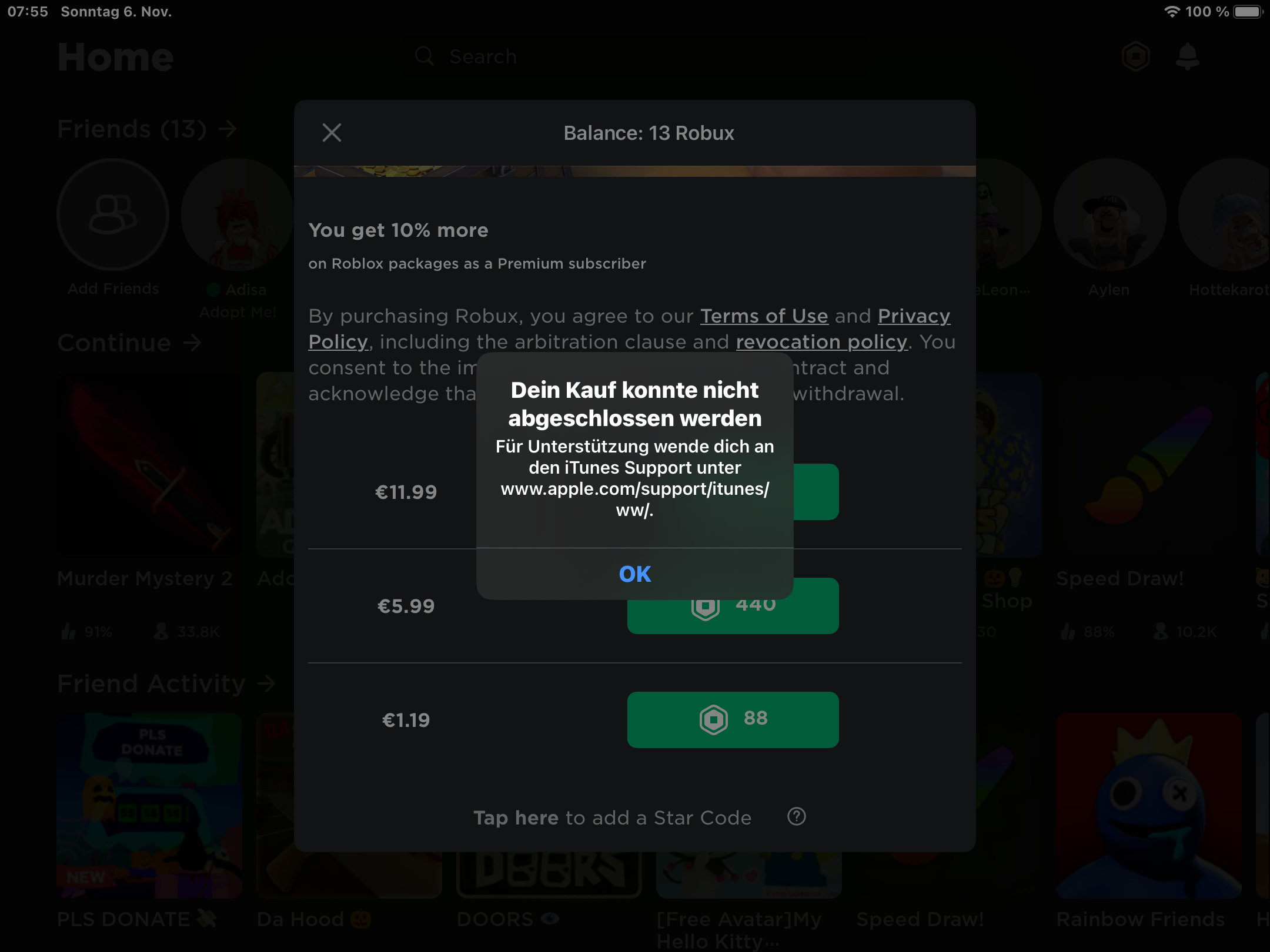 Ich benutzte roblox nun schon seit einem Jahr und meiner Zahlungsmethode hat immer funktioniert bis auf heute. Ich zahle immer mit Apple pay, mein Guthaben ist aufgeladen. Ich wollte mir dann robux kaufen und es trat ein „unbekannter fehler, bitte wenn sie sich an apple/support/itunes”