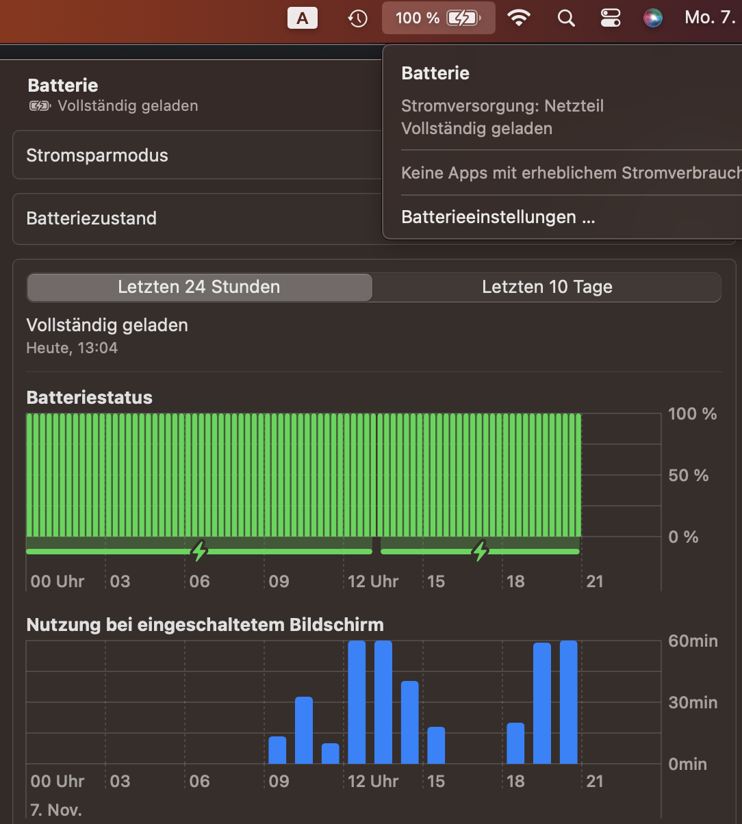 MacBook Air M2 vor ca. 3 Wochen gekauft. Immer an Strom angeschlossen benutzt. Noch immer wird es 100% geladen, obwohl die Option „optimiertes Laden der Batterie“ aktiviert ist. Eigentlich soll das MacBook erkennen, dass ich es immer an Strom angeschlossen benutze, und soll daher nur bis 80% geladen bleiben, nicht wahr? Warum bleibt es nach 3 Wochen langer Nutzung immer noch bis zu 100% geladen?