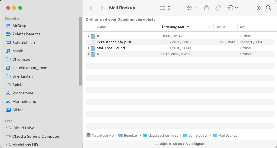 Im Einzelnen: Pfad Macintosh HD >Benutzer >claudaschon_imac >OrdnerSchreibtisch >Ordner Mail Backup: