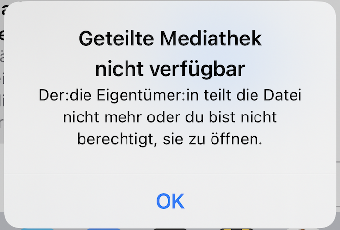 Ich habe eine geteilte Mediathek erstellt. Zu dieser habe ich sowohl meine Frau, als auch meine Tochter eingeladen. Die Einladung konnte von meiner Tochter angenommen werden. (iPad2021 + iPhone 8 | Jeweils mit der aktuellsten Betriebssystemversion).