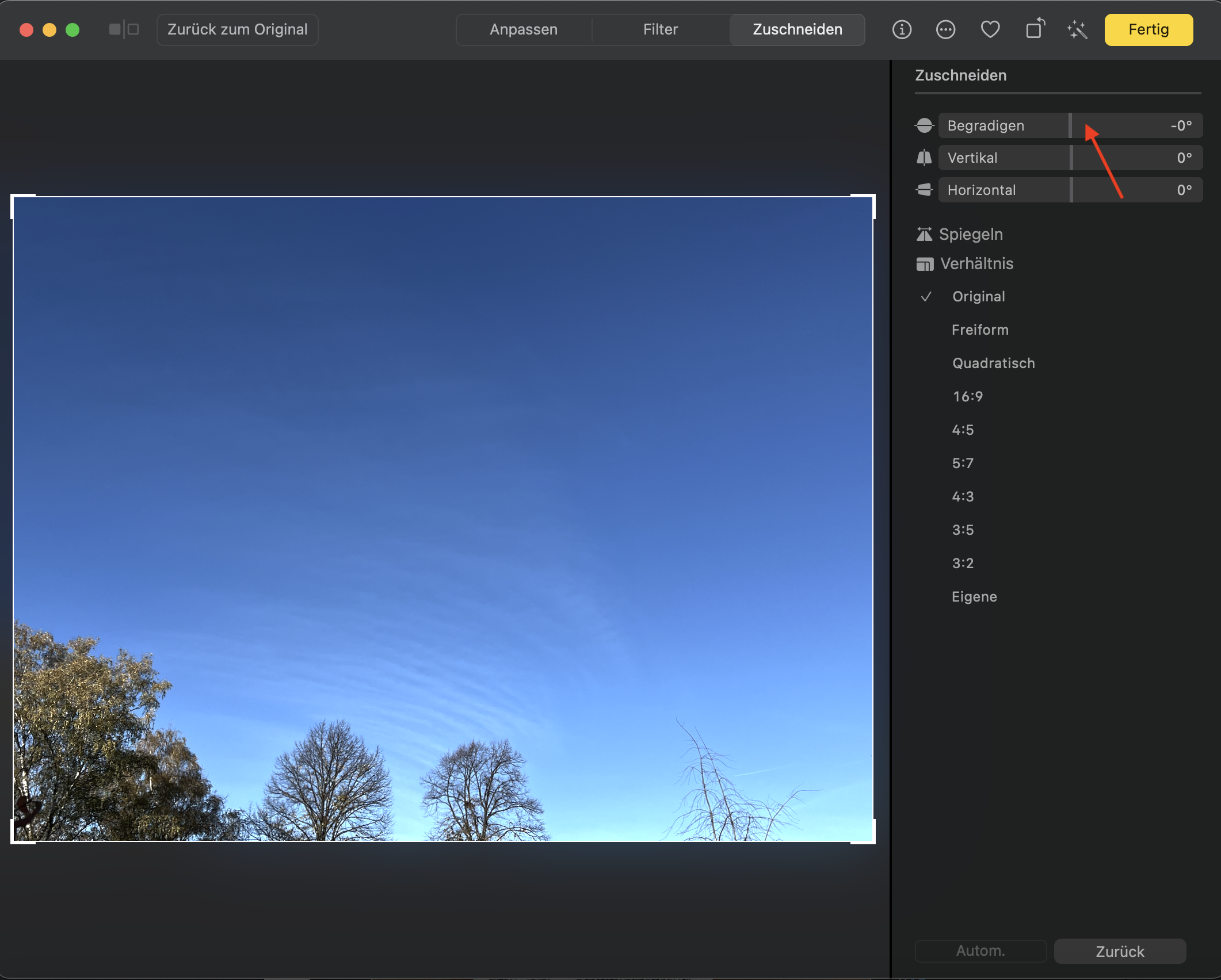 Das stimmt, drehen konnte ich das Foto nur über den kleinen Regler, auf den der Pfeil zeigt. Der Hinweis mit dem Trackpad hat mir noch gefehlt. 👍