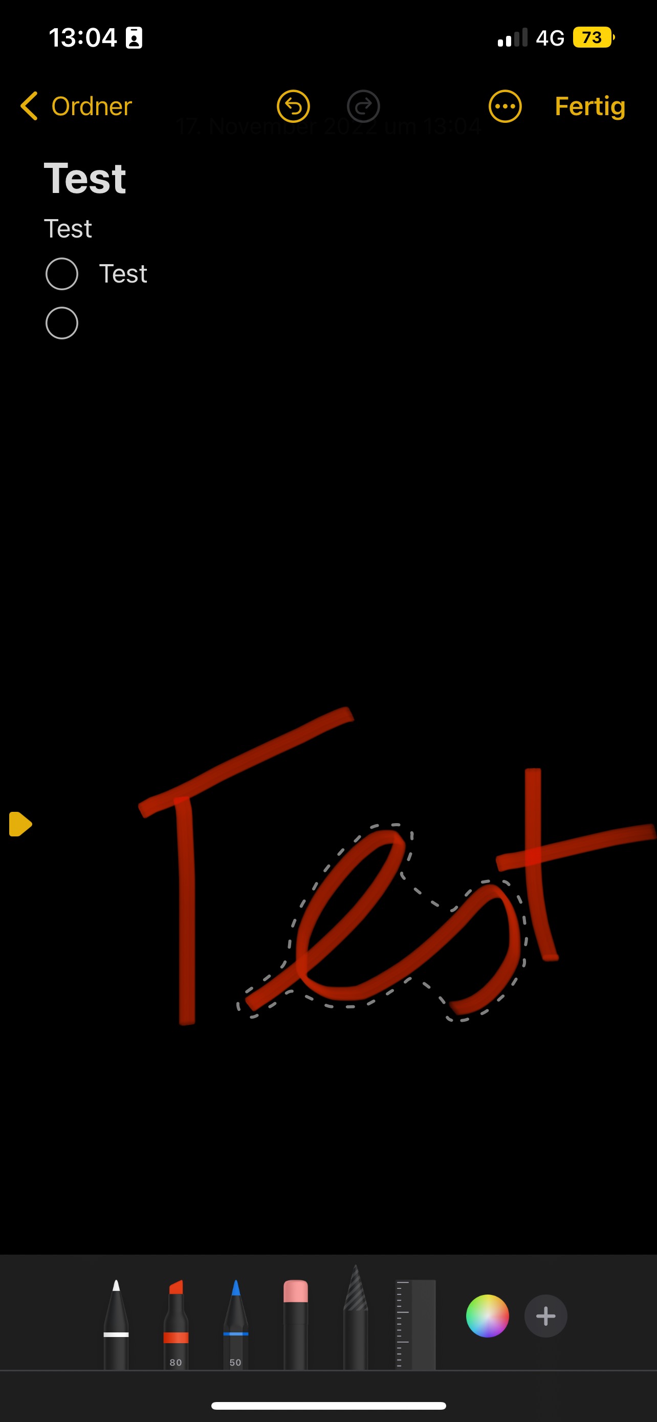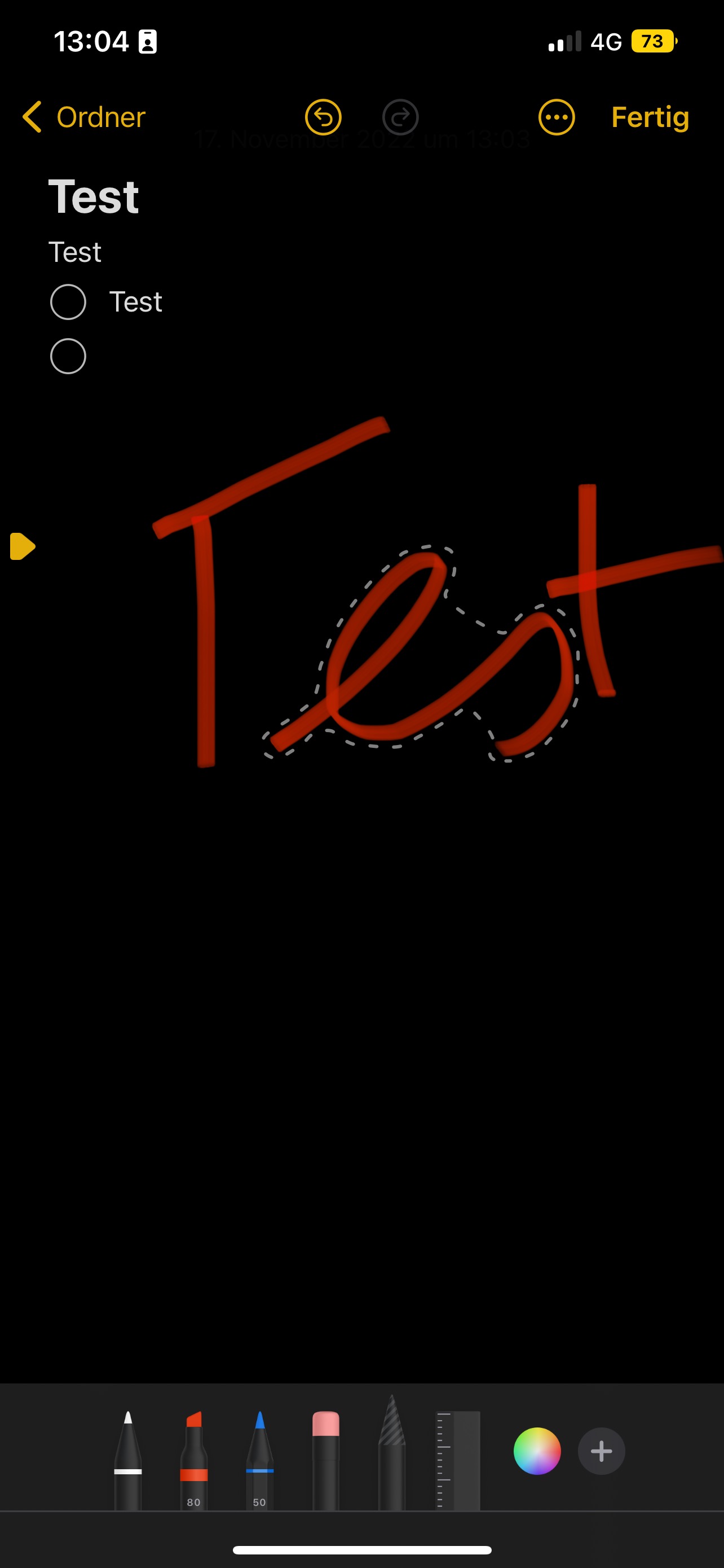 Standardmäßig erscheint die Linie unterhalb des letzten Eintrags in der Notiz. Wenn du allerdings den schwarzen Stift nimmst und deine Zeichnung markierst, dann erscheint eine gestrichelte Linie um die Zeichnung und dann ändert sich die Ansicht von dem gelben Dreieck links und du kannst dann diese Linie mitsamt der Zeichnung verschieben.