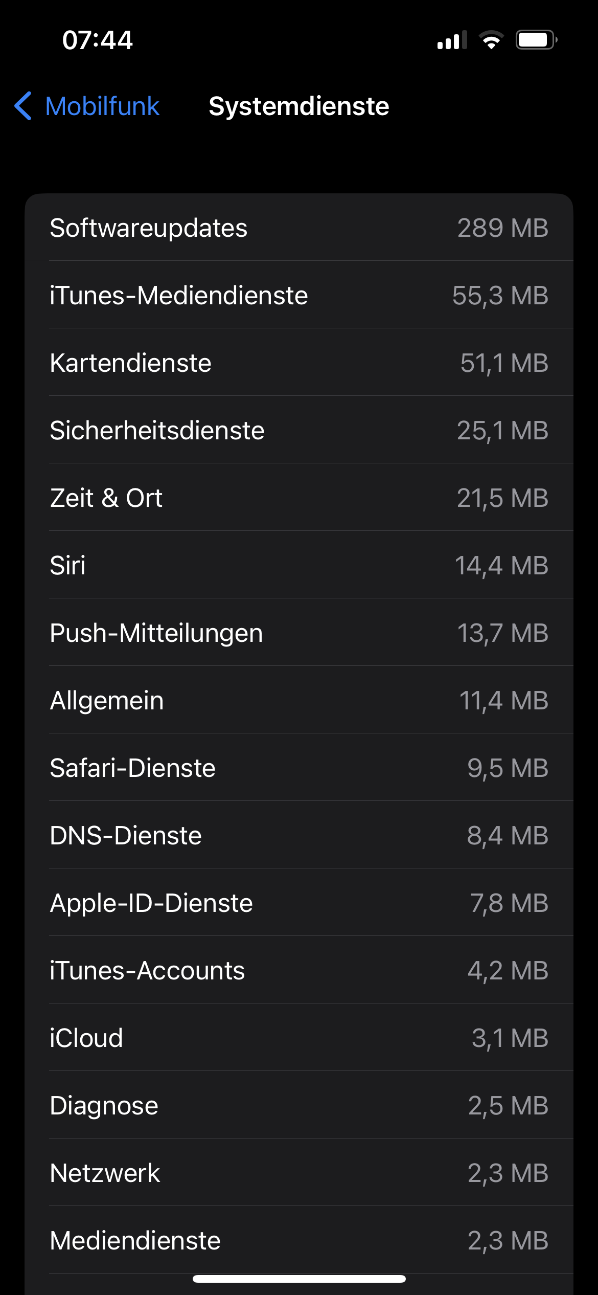 mit meinem jetzigen IPhone 13 habe ich nur 10Gb Daten, von welchen sich das IPhone zur Mitte des Monats 500mb gezogen hat. Mein aktueller Datenverbrauch ist bei 2gb. Das heißt, dass das IPhone ein Viertel aller Daten für irgendwelche (unnötigen) systemdienste verbraucht hat, obwohl das Gerät nur im Auto (1 Std. täglich) kein W-LAN hat…