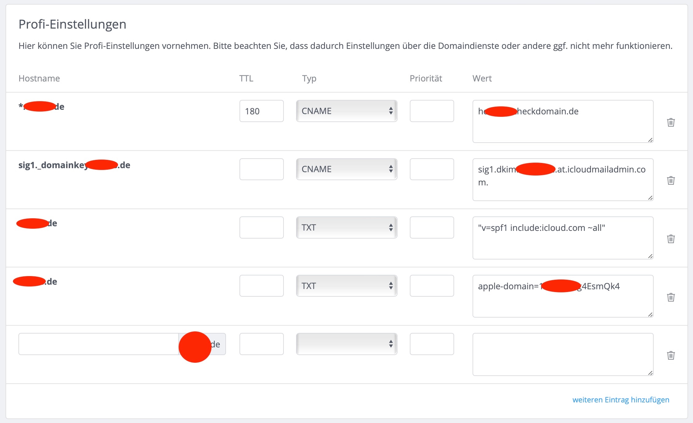seit geraumer Zeit ist es ja möglich eigene Domains bei Apple / iCloud einzubinden. Leider ist mir dies bisher nicht geglückt. Die Registrierung hat soweit geklappt, es scheitert leider an der Hinterlegung der Informationen (TXT, SPF...). Hat jemand Erfahrung mit der Einrichtung bei checkdomain.de?