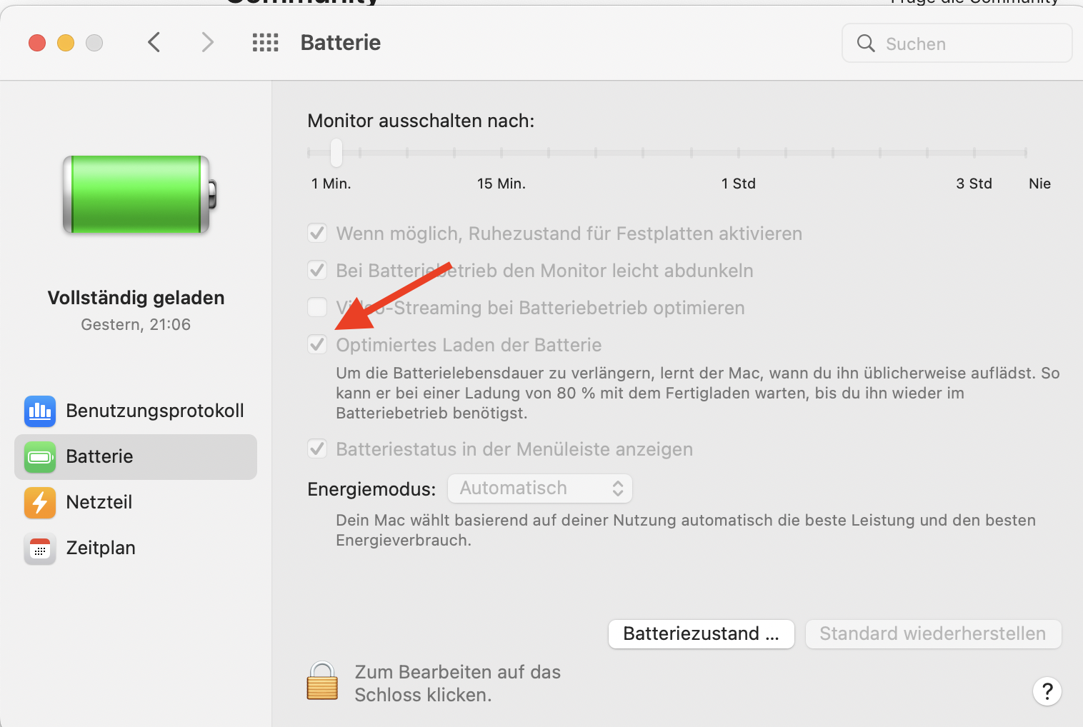 Einstellungen-->Batterie-->Optimiertes Laden aktivieren