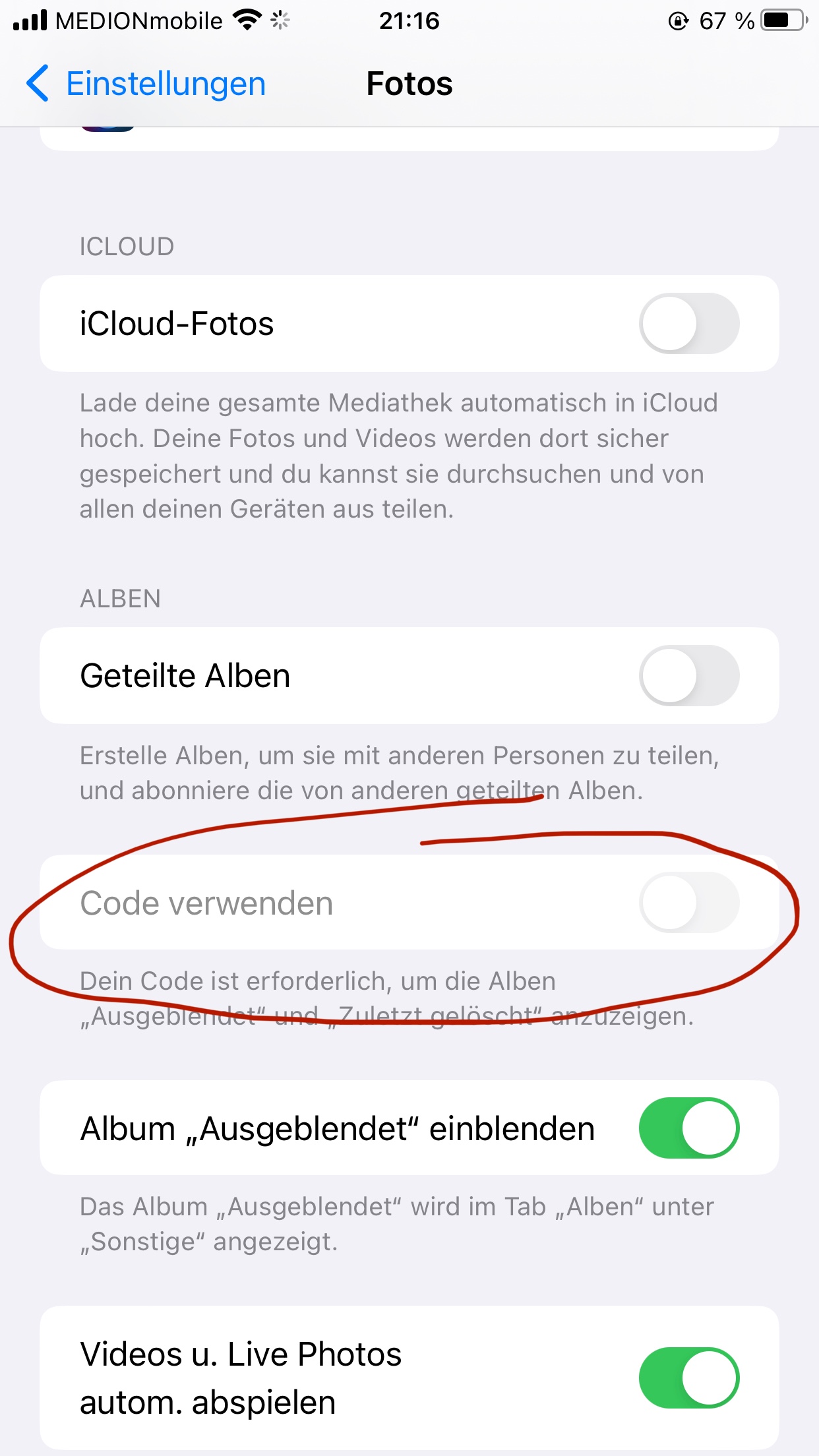 Ich möchte ein Code bei zuletzt gelöscht und ausgeblendet eingeben im Fotos App aber ich kann das nicht im Einstellungen machen
