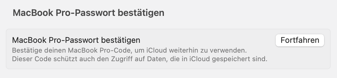 Ich bekomme seit der Inbetriebnahme meines neuen Mac (M2 mit Ventura 13.0.1) immer wieder den Hinweis angezeigt "MacBook Pro-Passwort bestätigen - Zur weiteren Verwendung von iCloud bestätige dein MacBook Pro-Passwort". Klicke auf die Meldung wechselt das System in die Systemeinstellungen (siehe Screenshot) wo im linken Auswahlbereich unter meiner Apple-ID wieder "MacBook Pro-Passwort bestätigen" auftaucht, mit einer 1 in einem roten Kreis und im rechten Fensterbereich steht: "MacBook Pro-Passwort bestätigen - Zur weiteren Verwendung von iCloud bestätige dein MacBook Pro-Passwort. Dieser Code schützt auch den Zugriff auf Daten, die in iCloud gespeichert sind". Daneben erscheint ein Button "Fortfahren". Ein Klicken darauf bewirkt ... nichts. Kurzzeitig ist ein kleines Fenster ohne Inhalt zu sehen.