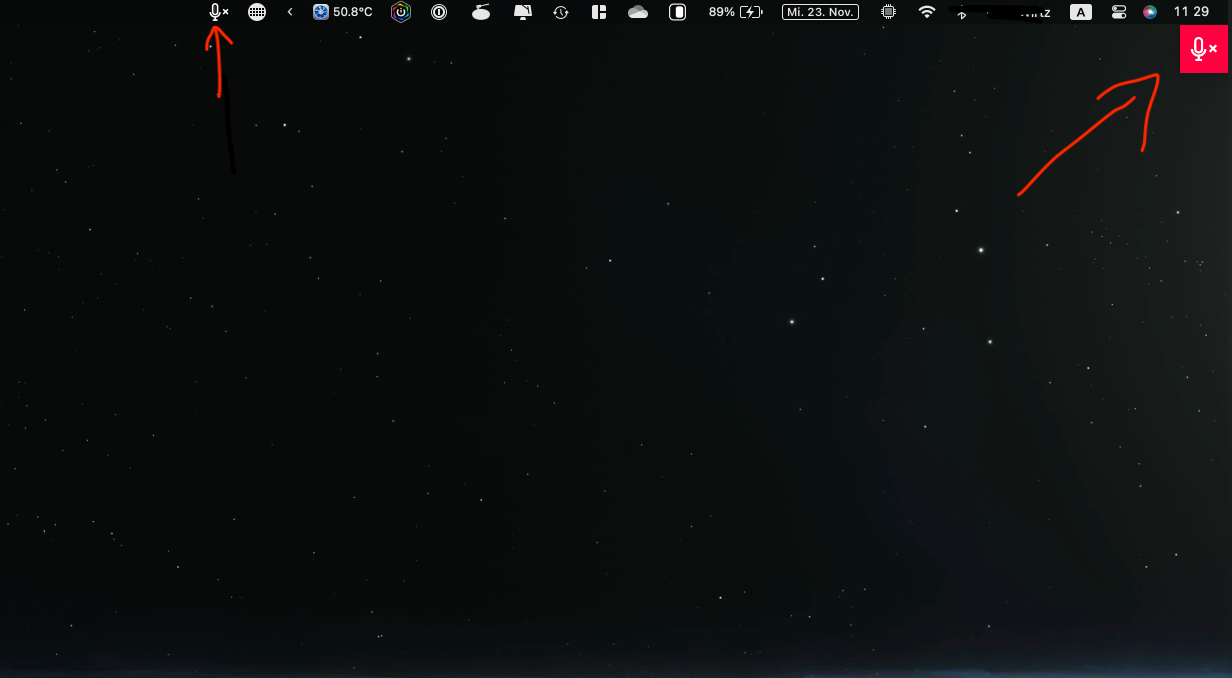 Hallo, seit einigerzeit habe ich dieses rote Symbol auf meinem Screen und weiß nicht wo es her kommt. Es ist immer im Vordergrund, egal welche app ich aufmache. Wenn ich versuche das Symbol in der menuleiste anzuwählen passiert nichts. Hatte schonmal jemand dieses Problem? Kriege das Symbol nicht weg, auch wenn ich das Mikrofon Mute und entmute.