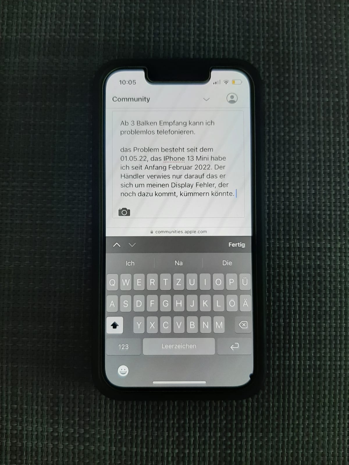 das Problem besteht seit dem 01.05.22, das IPhone 13 Mini habe ich seit Anfang Februar 2022. Der Händler verwies nur darauf das er sich um meinen Display Fehler, der noch dazu kommt, kümmern könnte.