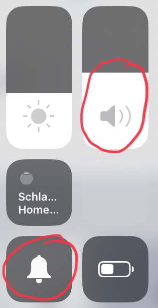 Stelle sicher, dass du den Stumm-Modus deaktiviert hast. Als Nächstes muss die iPad Lautstärke aktiviert sein. Siehe Bild: Ton an Glocke aus