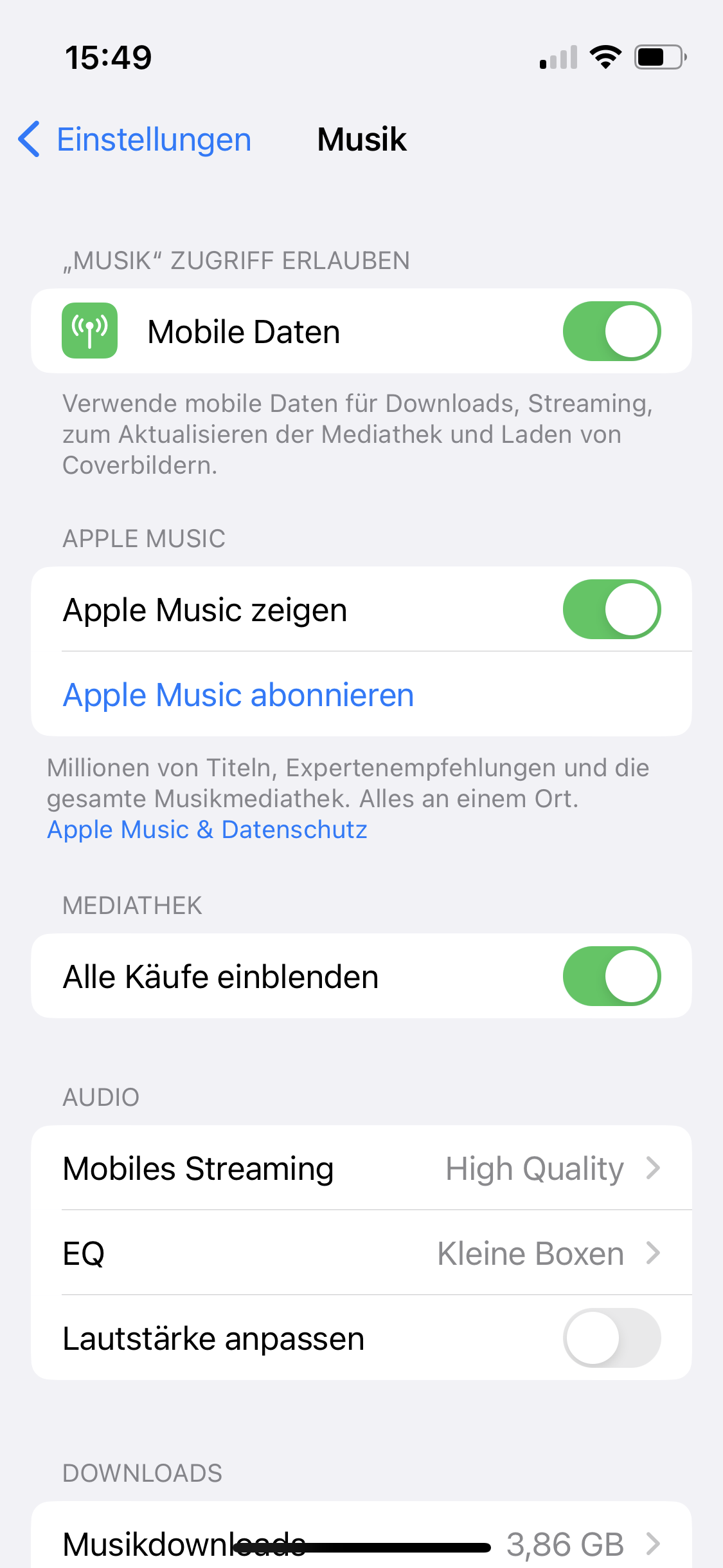 du wirst die Einstellung nicht haben, da du keine Musik über iTunes gekauft hast? Oder Musik mit deinem Mac/PC übertragen hast.