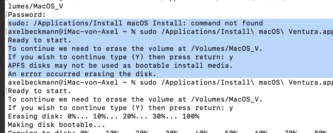 "axelbeckmann@65159dda-4f65-4788-9d05-eeabc2dfc87a ~ % sudo /Applications/Install\ macOS\ Install Ventura.app/Contents/Resources/createinstallmedia --volume /Volumes/MacOS_V