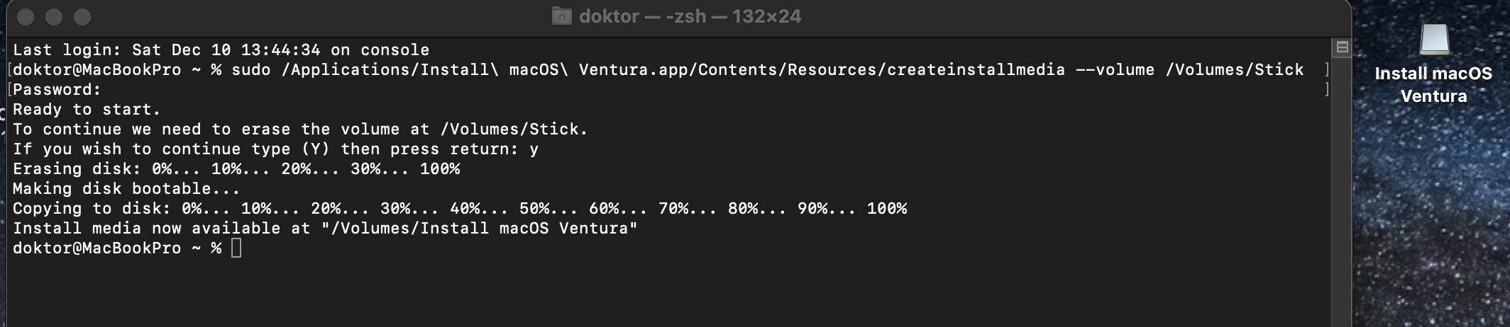 sudo /Applications/Install\ macOS\ Ventura.app/Contents/Resources/createinstallmedia --volume /Volumes/Stick