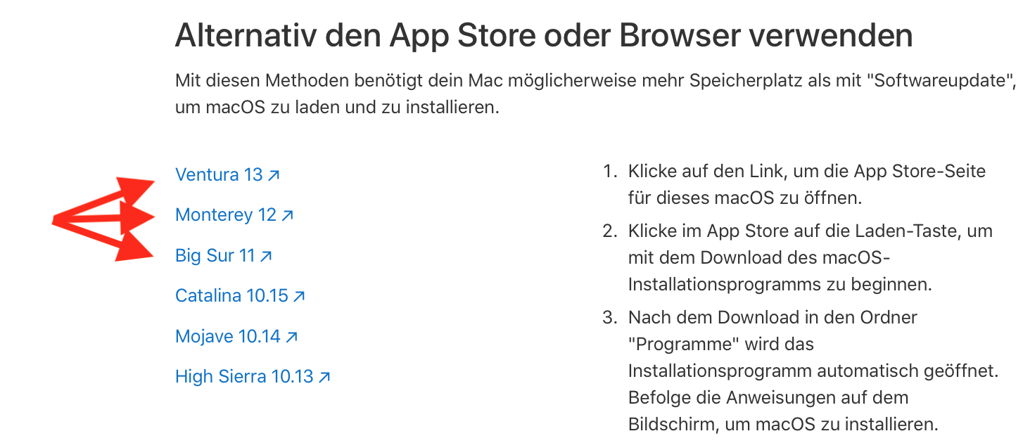 wenn du auf der Suche nach einem MacOS-Upgrade bist, kannst du das entsprechende MacOS von der nachfolgenden Seite des Apple Support mit Safari herunterladen und installieren...