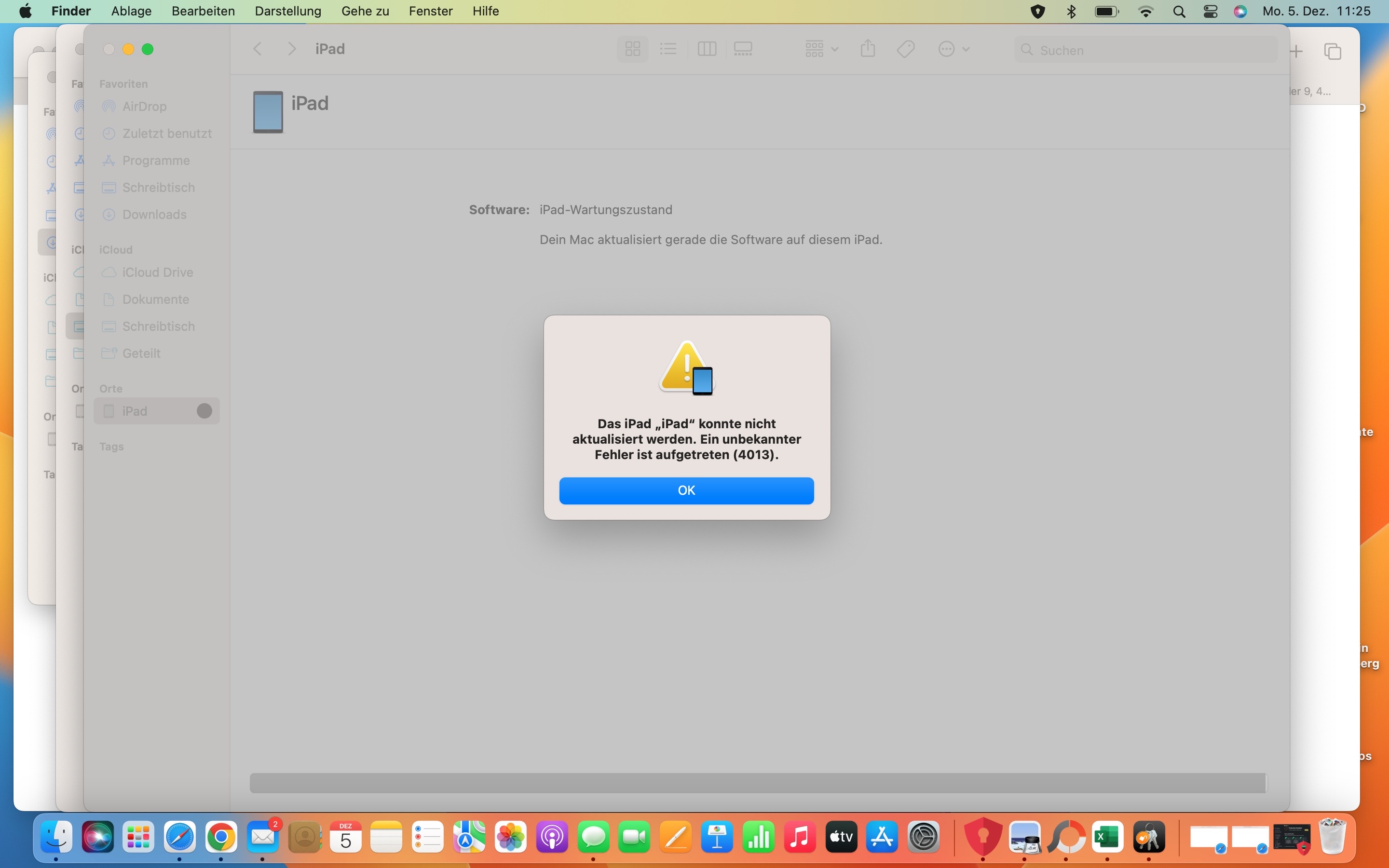 Bei Verbindung mit meinem Mac wird zuerst die Software zur Aktualisierung heruntergeladen, dann das Paket extrahiert und beim Aktualisieren der Software erhalte ich die Fehlermeldung 4013.