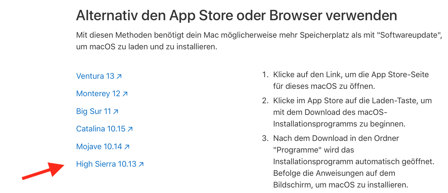 Für das Upgrade auf High Sierra starte Safari ❗️und klicke einfach den mit rotem Pfeil markierten Link auf der nachfolgenden Seite des Apple Support an
