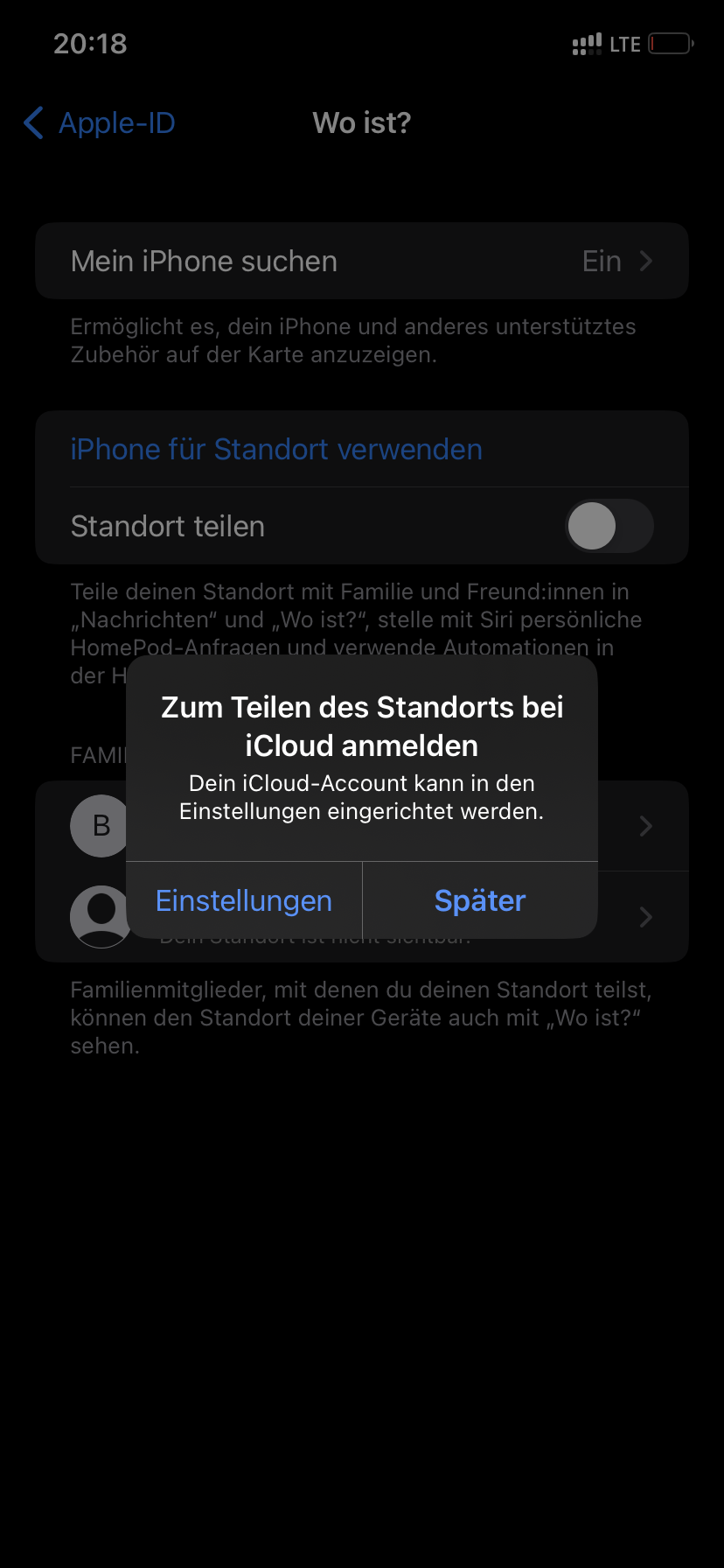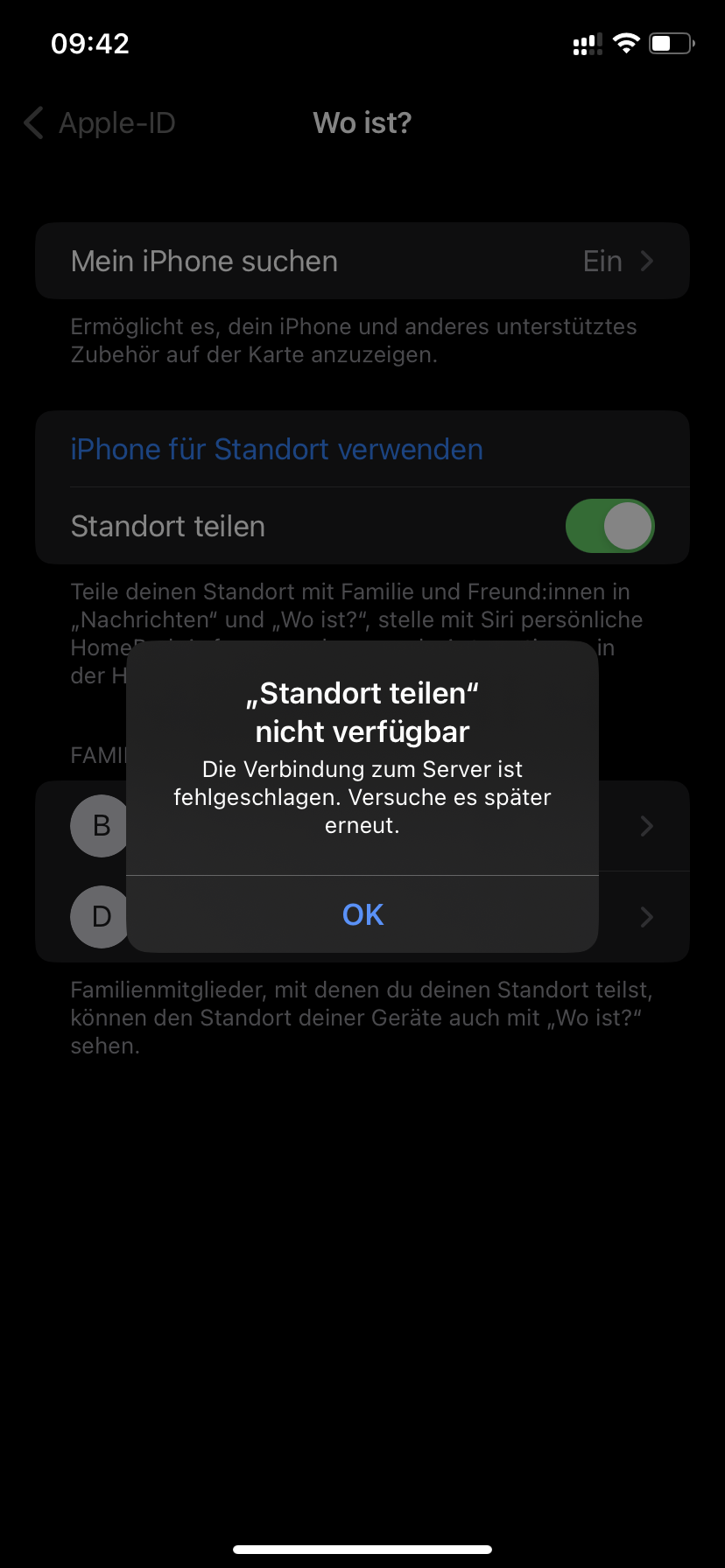 Hallo, ich habe das Problem, dass ich nur Geräte in Wo ist orten kann. Wenn ich unter Einstellungen „Standort teilen“ aktivieren möchte erscheint nur eine Fehlermeldung Server nicht verfügbar….habe bereits alle Einstellungen deaktiviert und anschließend aktiviert ohne Erfolg. iPhone neugestartet auch.