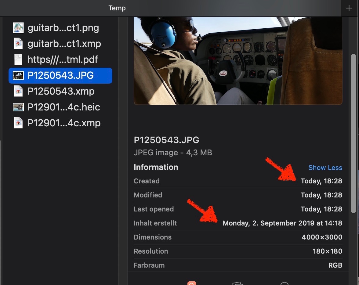 Wenn du iCloud Fotos verwendest, und wenn dann die Fotos aus der iCloud zurück auf den Mac geladen werden, sicherst du beim Exportieren eine Kopie des Fotos aus der Cloud, keine Kopie des Fotos vom selben Laufwerk. Nur wenn ein Foto auf demselben Laufwerk dupliziert werden kann, kann ein Clone mit denselben Erstellungsdaten angelegt werden, aber nicht beim Kopieren aus der Cloud. Wir bekommen dann eine neue Datei mit dem Erstellungsdatum, wann diese neue Datei angelegt worden ist. Selbst im Paketinhalt meiner iCloud Fotosmediathek auf dem Mac ist das ursprüngliche Erstellungsdatum gar nicht mehr vorhanden. Alle Dateien im Ordner Originals zeigen das Datum, wann diese Fotos aus der Cloud heruntergeladen worden sind.