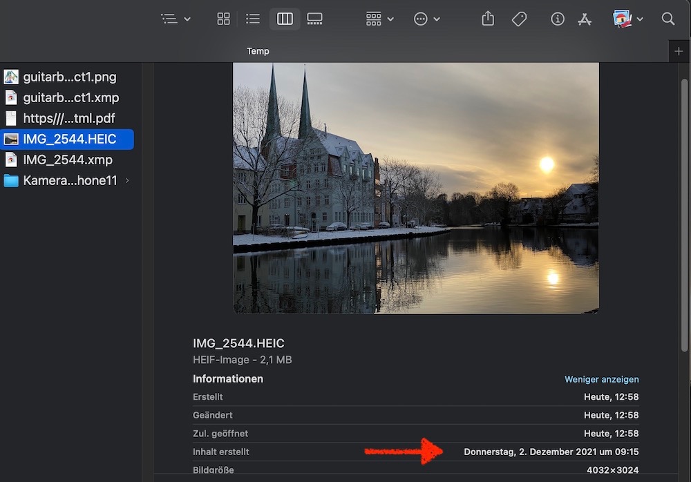 Wir können das Aufnahmedatum in der Vorschau oder im Finder in Spaltendarstellung unter "Inhalt erstellt" sehen. Zum Beispiel: Diese Bilddatei wurde vor einer Woche aus der Cloud in die Mediathek heruntergeladen, aber das eingebettete Aufnahmedatum "Inhalt erstellt", zeigt weiterhin an, wann das Foto aufgenommen wurde.