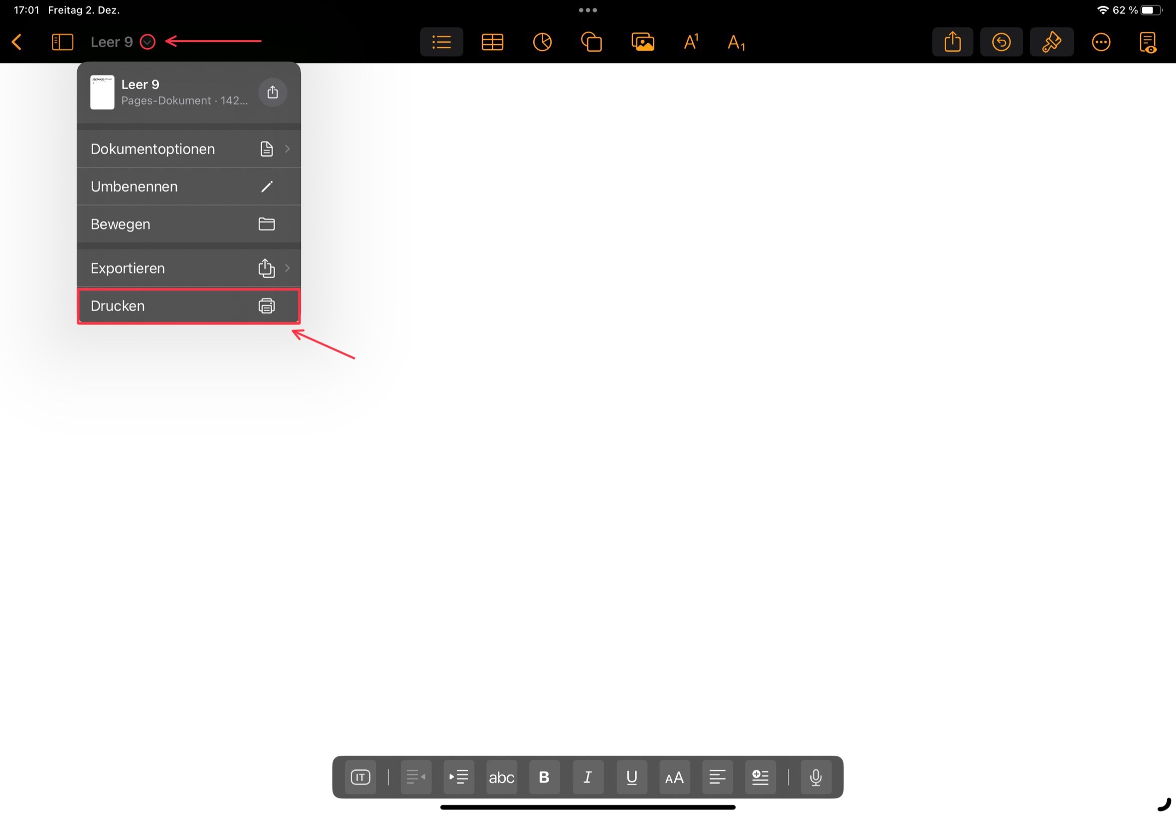 um dein Pages-Dokument zu drucken, klickst du rechts neben dem Dateinamen auf den kleinen Pfeil und anschließend auf „Drucken“ (wurde unter iPadOS verschoben):