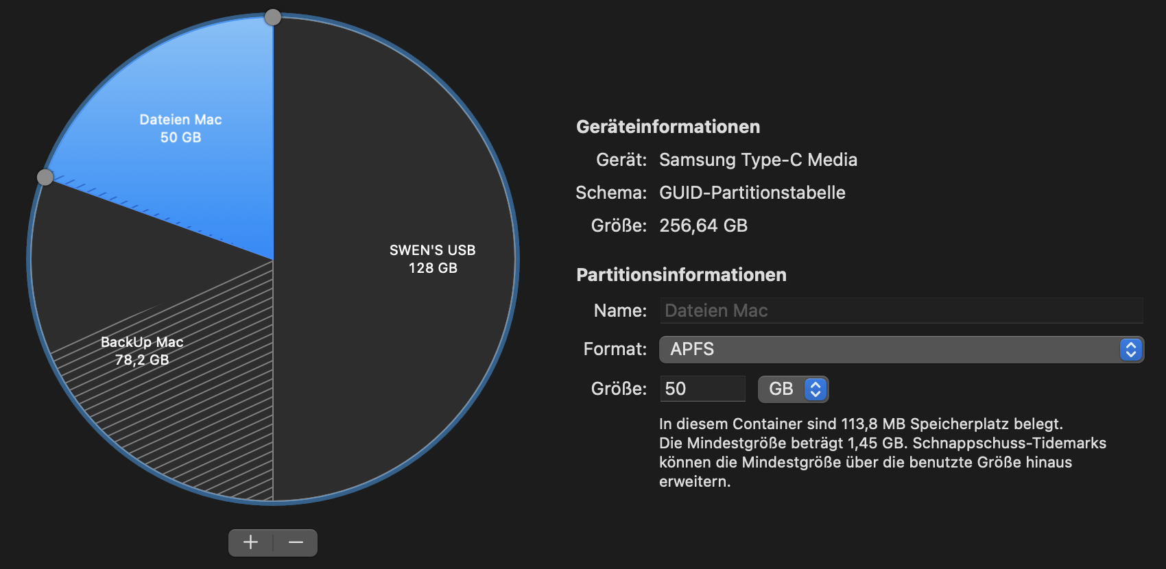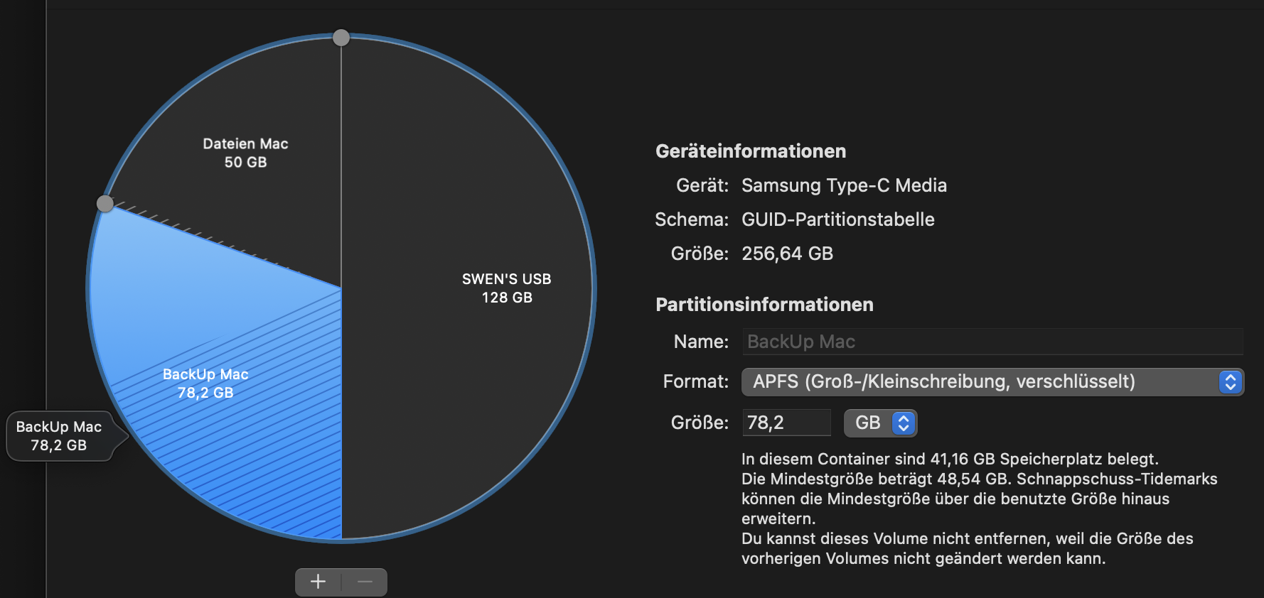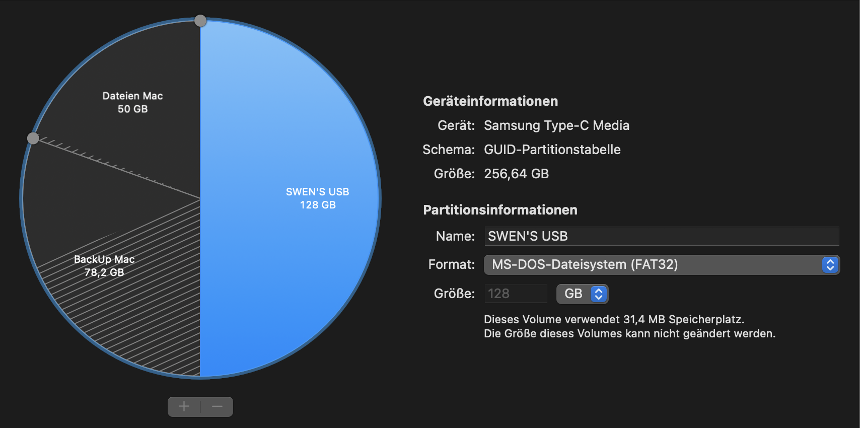 Nun zu meiner Frage. Wie formatiere ich den Stick mit 250 GB so, dass zumindest die FAT32 Partition von Windows erkannt wird, er ein MacOS Backup aufnehmen und Dateien vom Mac separat auf einer dritten Partition speichern kann?