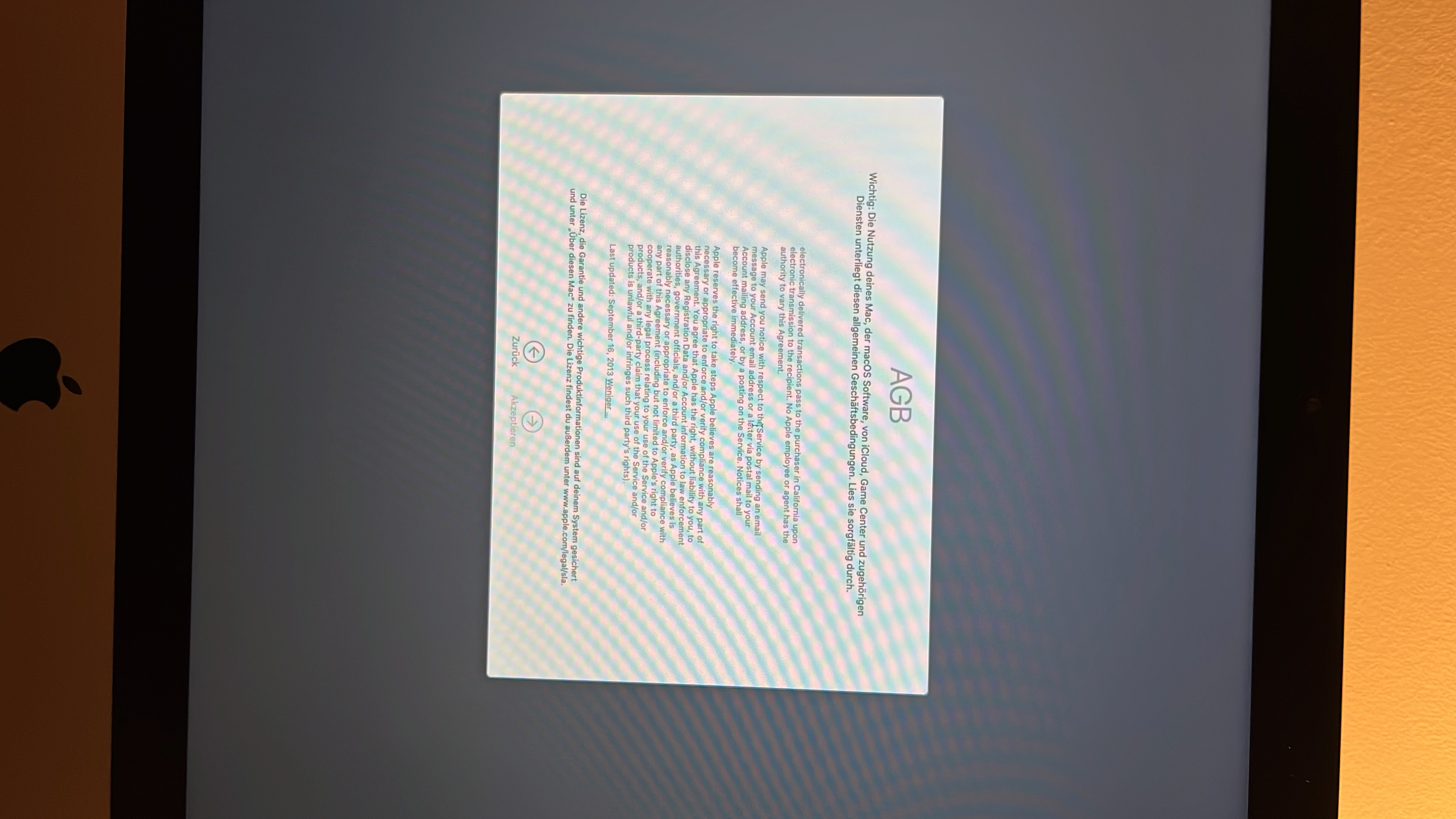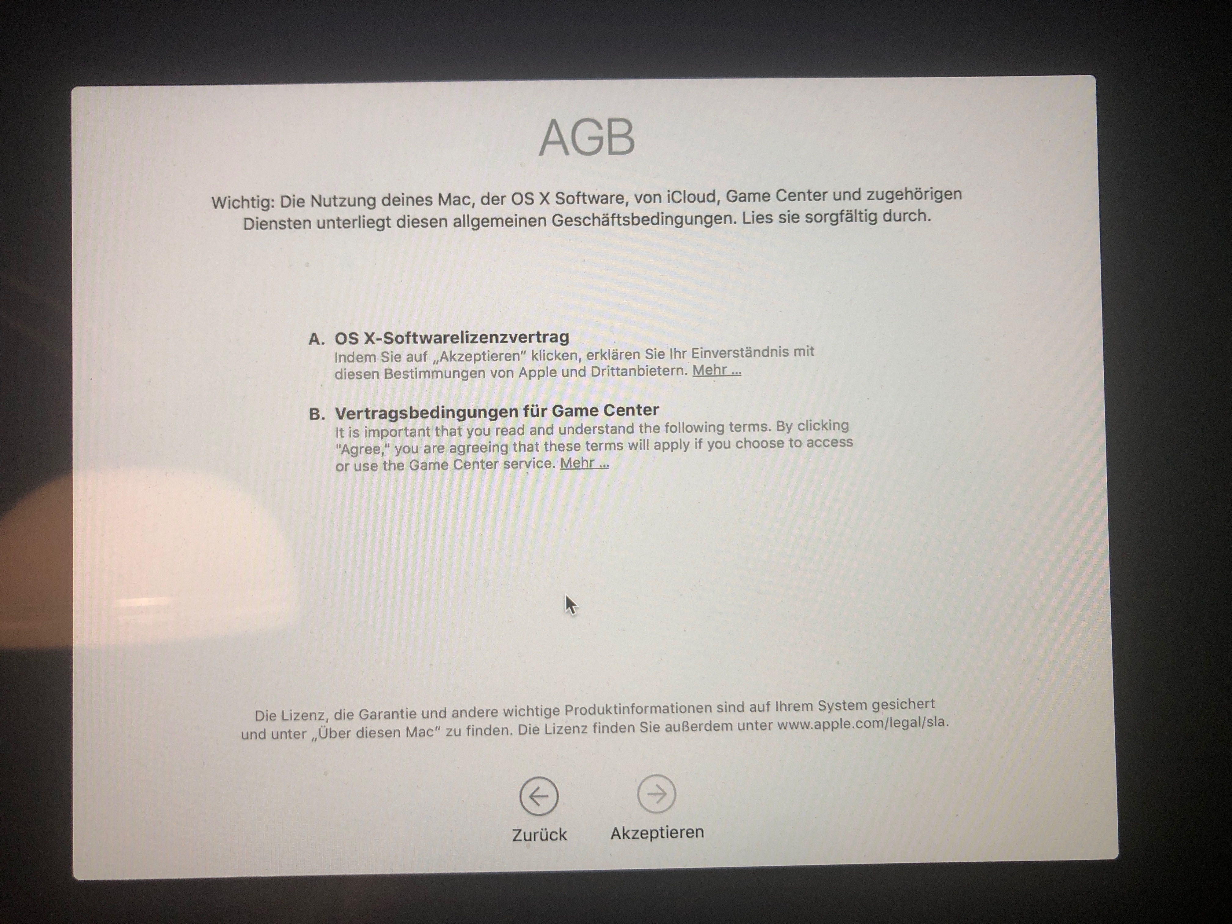 ich habe meinen alten Mac komplett zurück gesetzt und will in gerade neu installieren. Bei den AGB´ist das Feld "Akzeptieren" grau und ich kann nur "zurück" aber komme sonst nicht weiter.