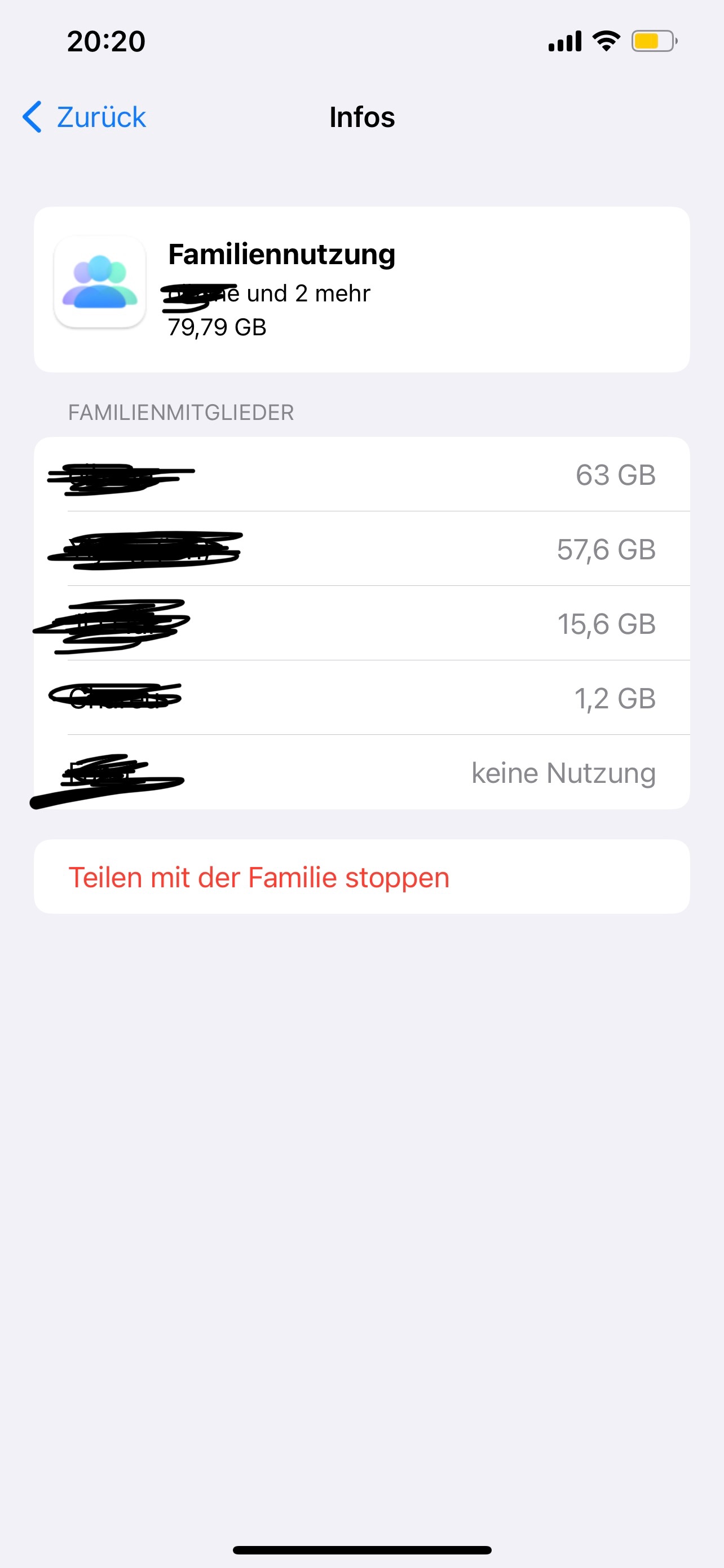 ich habe Personen aus der „Familienfreigabe“ entfernt. Diese Personen werden zwar nun nicht mehr unter „Familienfreigabe“ gezeigt, jedoch immer noch unter „Familiennutzung“ bzgl. iCloud Speicher. Ich habe jetzt manuell wo es geht die Nutzung der iCloud Speicher auf dem anderen Handy abgeschaltet (jetzt aufgelistet als „keine Nutzung“ aber das ist ja keine wirkliche Lösung. Einen der entfernten Accounts wird nämlich gar nicht mehr benutzt und da kann ich die Nutzung entsprechend nicht auf dem Handy manuell deaktivieren. Eine Idee was hier das Problem ist und wie man das löst?