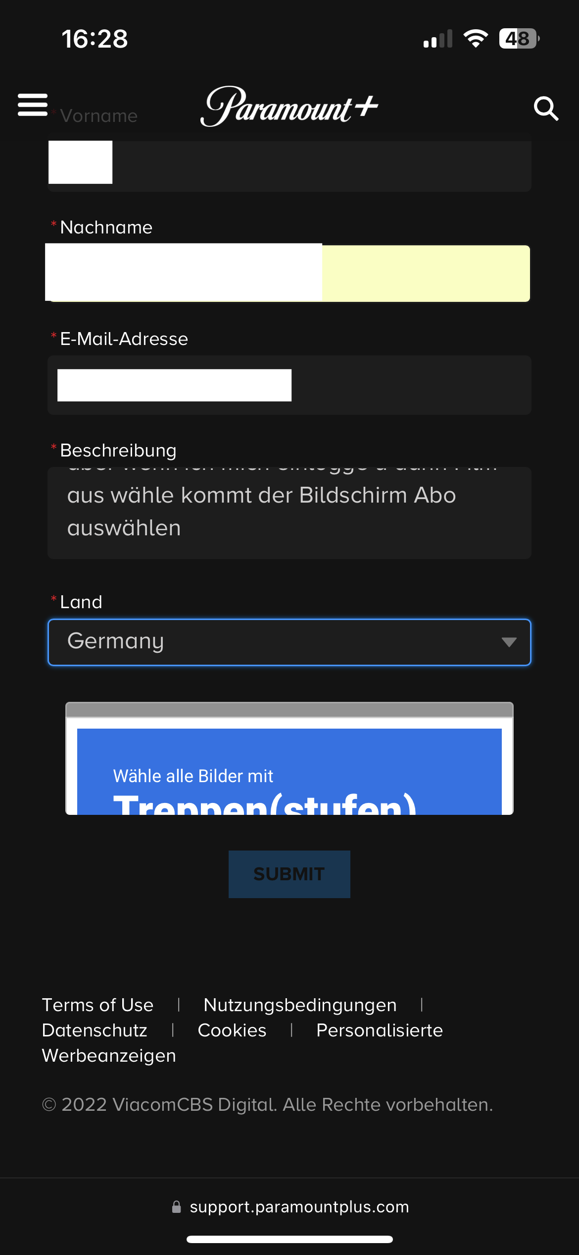 Habe alle Anweisungen vom Support befolgt habe auch versucht den Kunden Support anzuschreiben wenn Mann versucht den Support anzuschreiben soll Mann seine Daten angeben u den Fehler beschreiben u das Problem mann kann es nicht abschicken will Mann soll kicken bin kein Roboter u dann kommt ein Bild was Mann anwählen soll das Bild erscheine aber nicht komplett habe es über iPad iPhone u Windows pc versucht sieht immer so aus