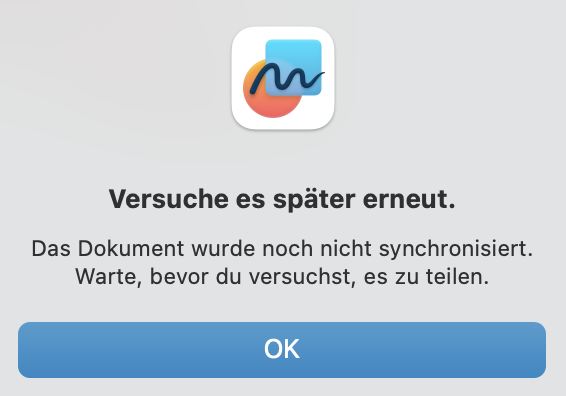 ich möchte ein Board teilen, bekomme jedoch fortwährend die Meldung "Versuche es später erneut. Das Dokument wurde noch nicht synchronisiert. Warte, bevor Du versuchst, es zu teilen."