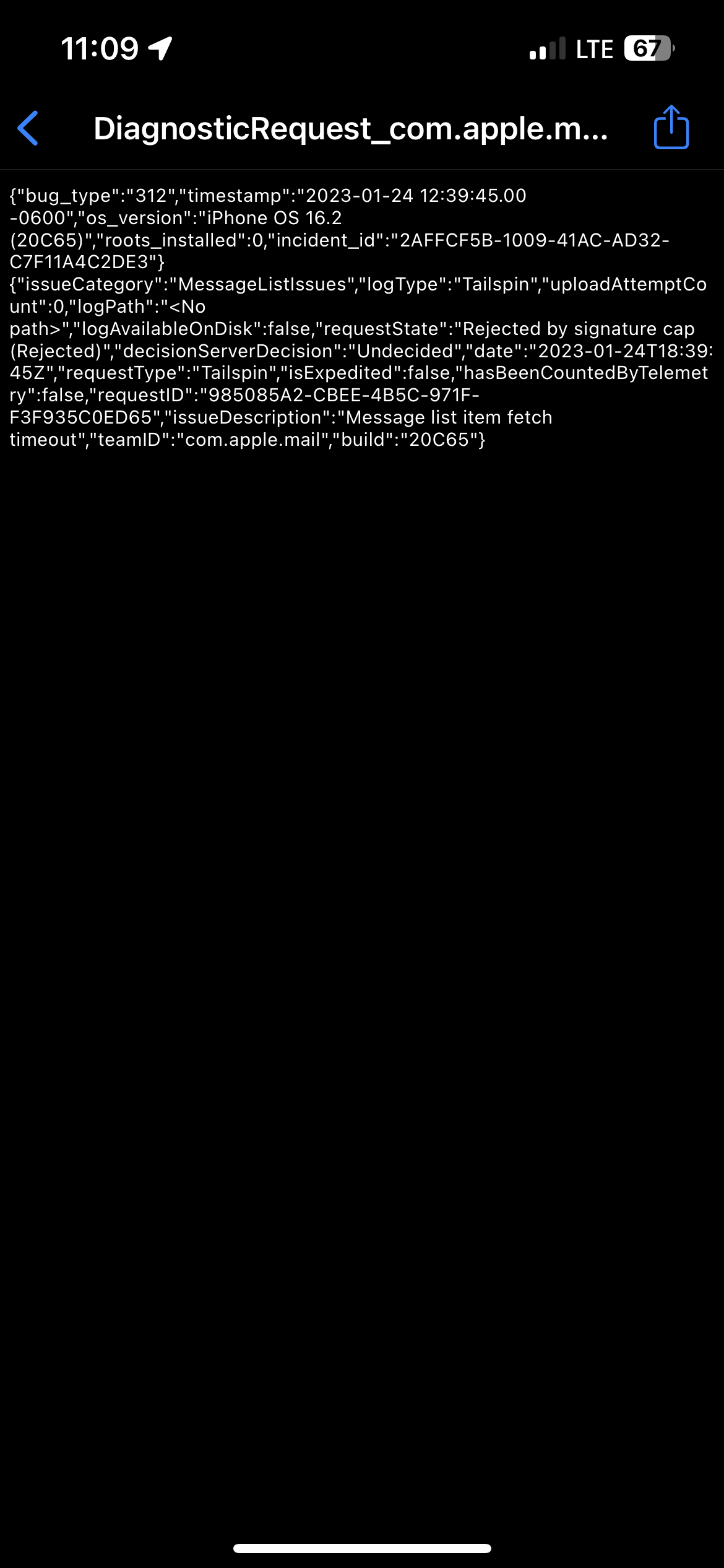{"issueCategory":"MessageListIssues","logType":"Tailspin","uploadAttemptCount":0,"logPath":"<No path>","logAvailableOnDisk":false,"requestState":"Rejected by signature cap (Rejected)","decisionServerDecision":"Undecided","date":"2022-12-17T20:41:14Z","requestType":"Tailspin","isExpedited":false,"hasBeenCountedByTelemetry":false,"requestID":"****","issueDescription":"Message list item fetch failed with error: NSError Domain=EMErrorDomain Code=1 EMInternalErrorReasonKey=Failed to get message list item for objectID: <EMThreadObjectID: ****> (null) ConversationID:-****, EM","teamID":"com.apple.mail","build":"20C65